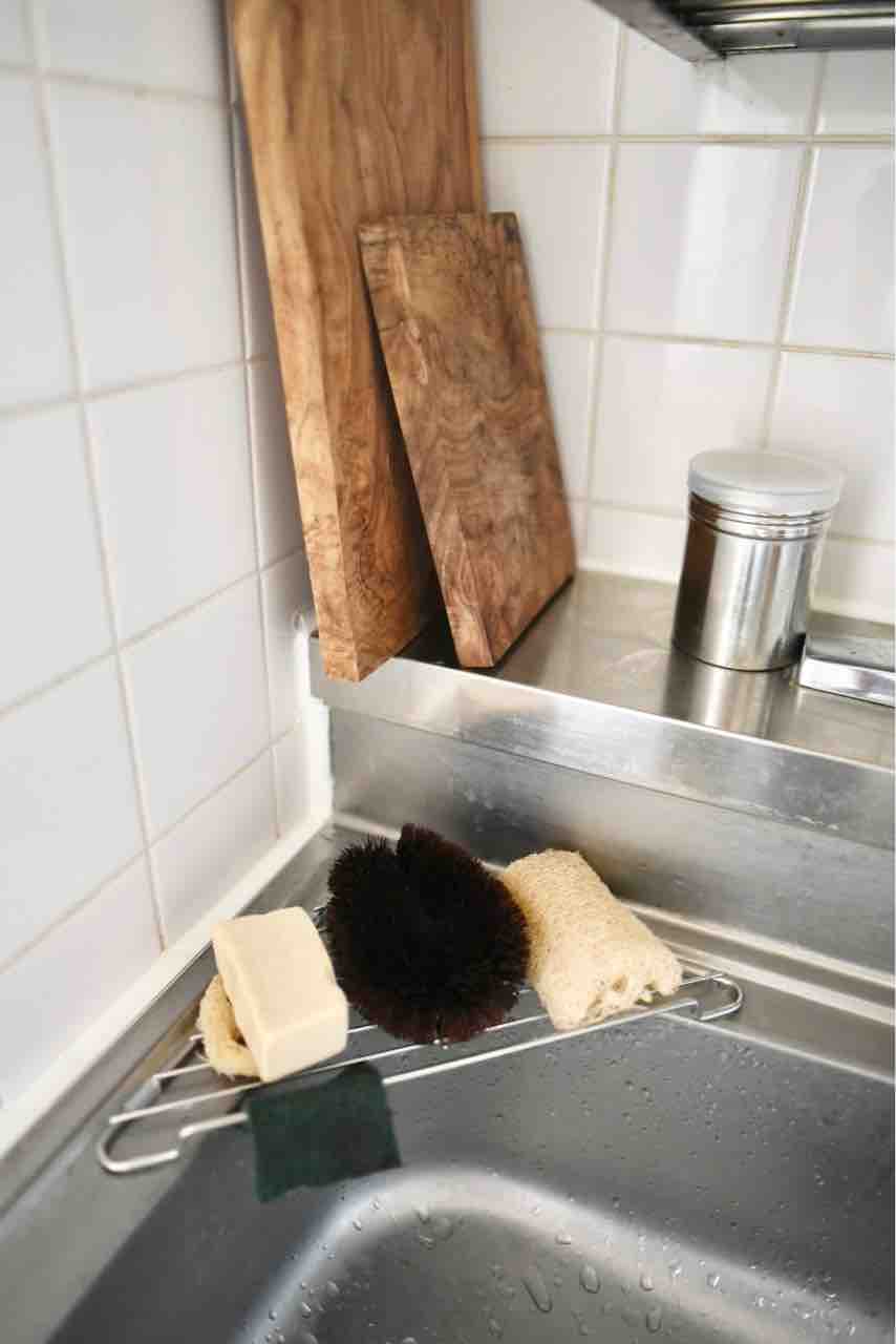 食器洗いのメインは「びわこふきん」であり、こちらはキッチンに作り付けの吊り水切り棚に干しているのですが、それ以外にも、まな板やフライパンを洗うのにたわしやへちまや石けんが必要です。