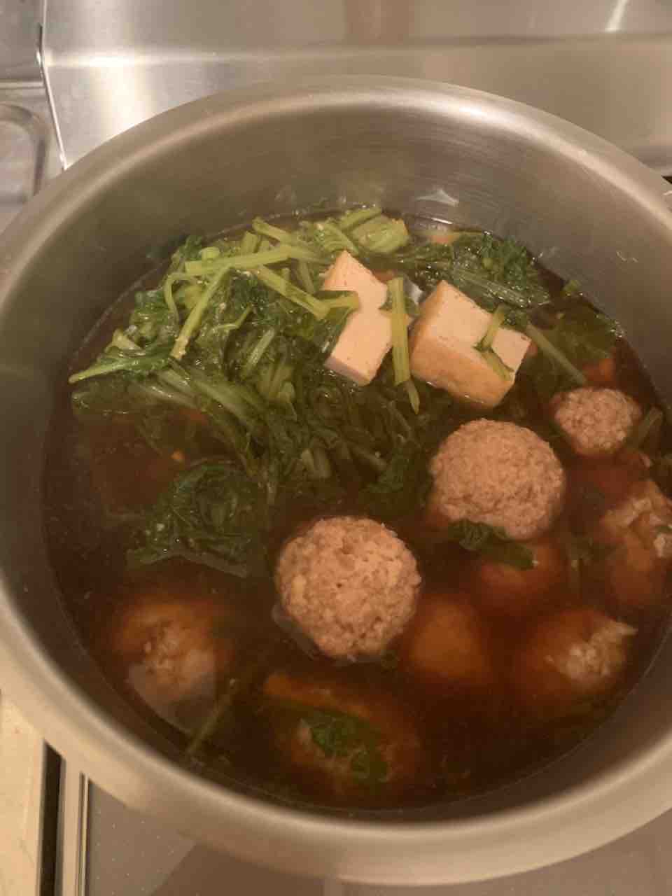 鶏もも挽肉、レンチン玉ねぎ、大和芋、卵 で鶏丸を作り、大根菜、厚揚げ とともに煮物にしました。