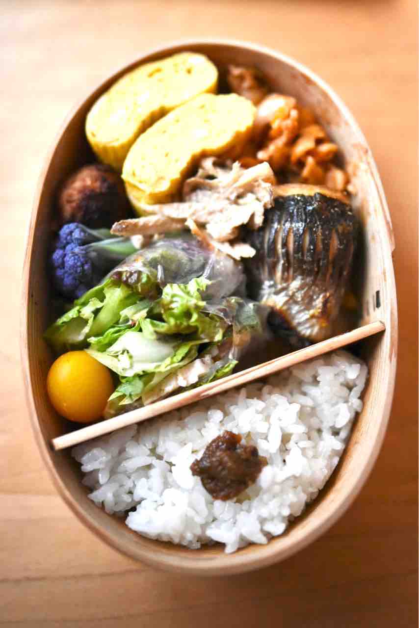 出汁巻き玉子、トマトパスタ、鶏丸、ごぼうサラダ、鯵塩焼き、鶏ハム入り生春巻き、赤カリフラワー、黄ミニトマト、白飯、蕗味噌
