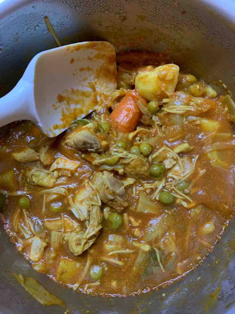 鶏もも肉、玉ねぎ、にんじん、ピーマン、グリーンピース、えのきだけ でスパイスカレーを作りました。