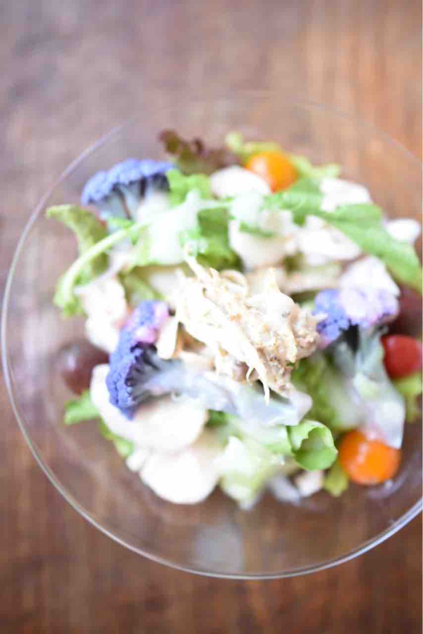 赤カリフラワー、サニーレタス、ごぼうサラダ、カラーミニトマト、ルッコラ、鶏ハム でサラダも作りました。赤カリフラワーは茹でると青くなりました。