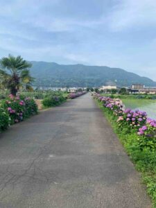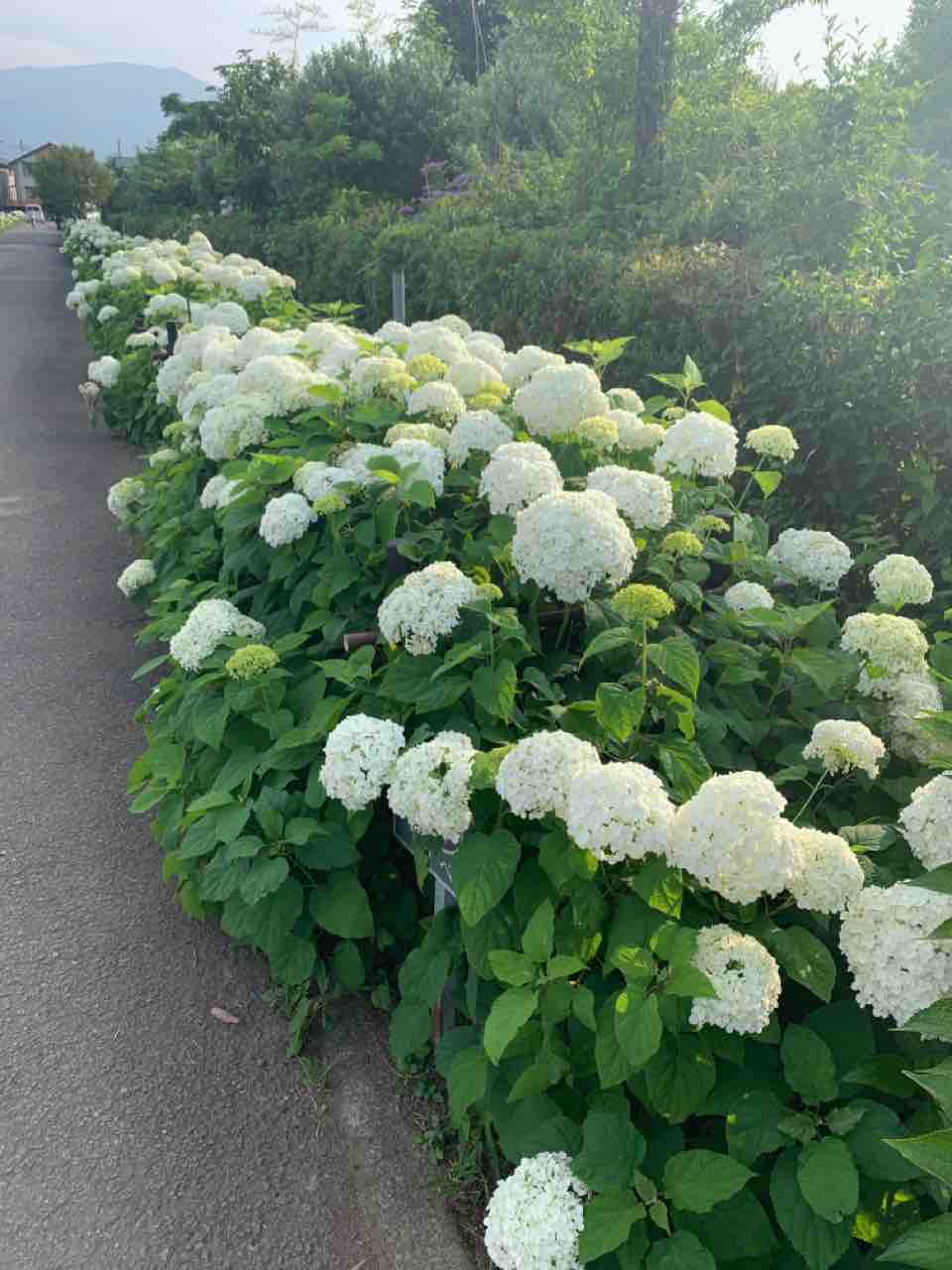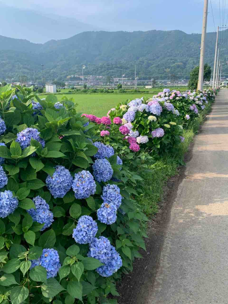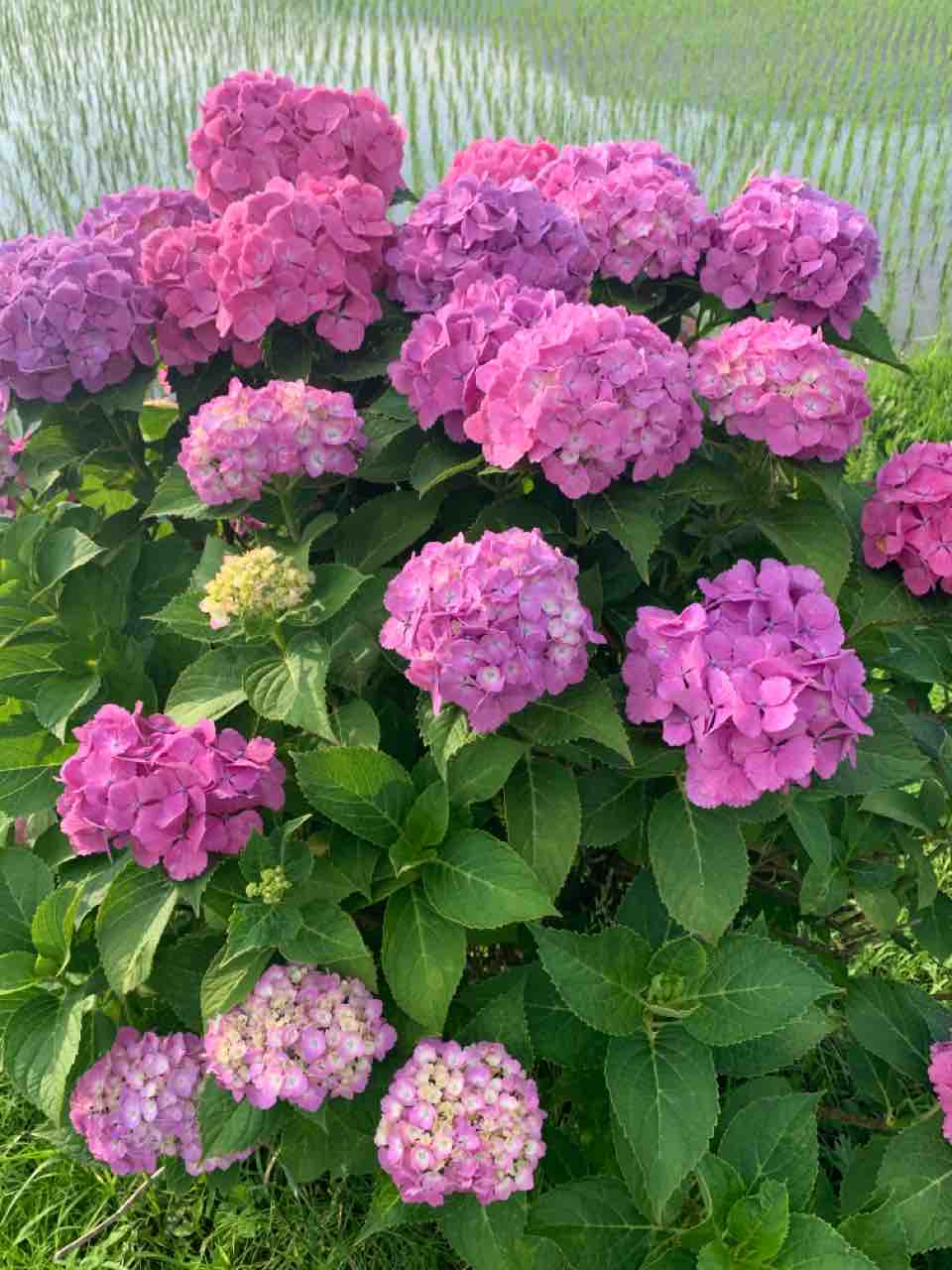 田んぼのあぜ道にあじさいがたくさん植えられてすごく迫力がありました。