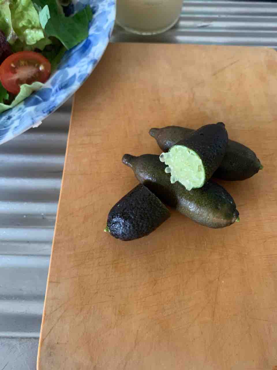 人の指の太さくらいのライムなのですが、カットしてぎゅっと押すと、まるでキャビアのような丸くプチプチとした果肉がポロポロと出てきました。