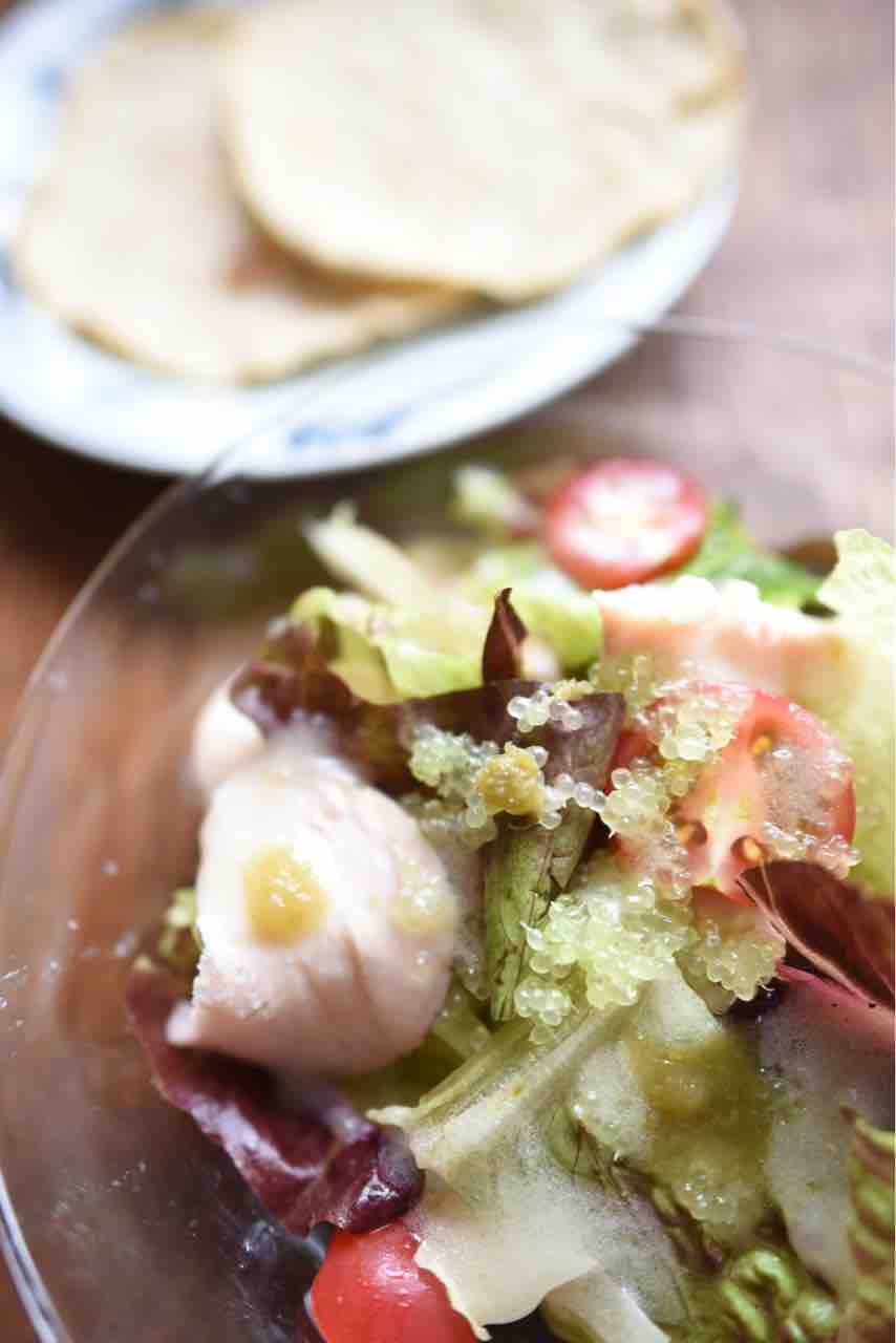 さっそく、レッドロメインレタス、鶏ハム、カラーミニトマト でサラダを作り、フィンガーライムを散らしました。