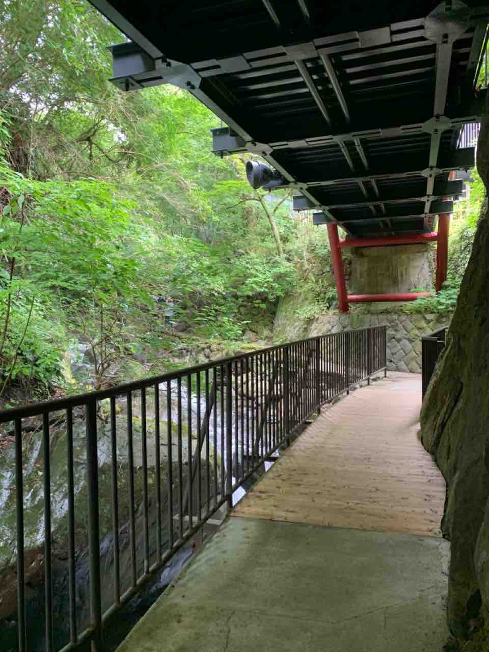 トンネルを抜けると滝になっており、右に折れてずんずん進むと、「惣湯テラス」という、日帰り温泉の建屋が現れました。