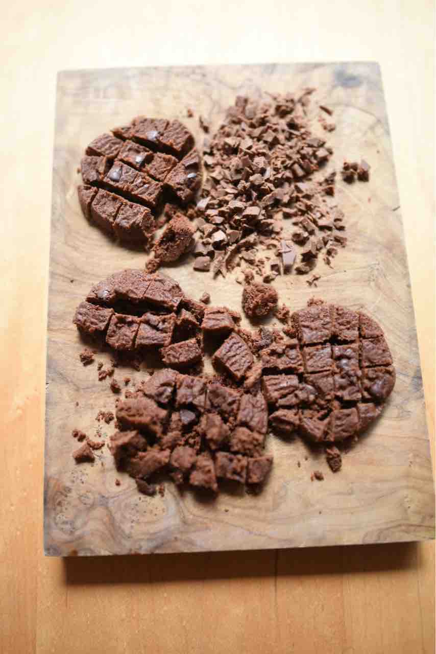 - 低糖質チョコレートは5mm角に、低糖質チョコチップクッキーは1cm角に刻みます。