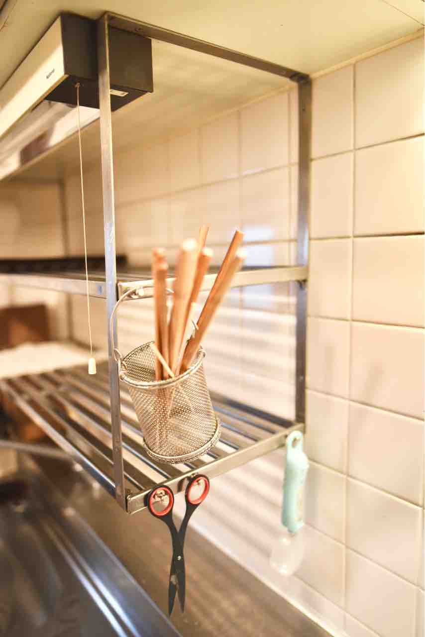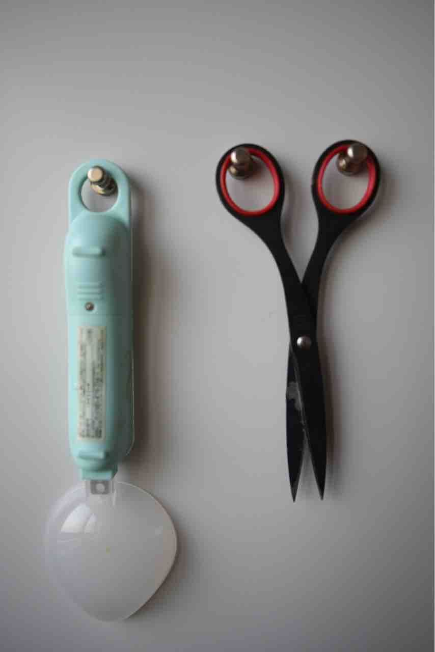 このようにコンパクトな形状なのに色んなものを吊せてすごく便利なのです。ウチでは、ハサミ、デジタル計量スプーン、箸立て などを吊り下げるのに重宝しています。ちなみに、デジタル計量スプーンは毎日、コーヒー豆の計量に使っています。茶葉を計ることもあります。とにかく毎日1回以上必ず使うものです。ハサミも同様。