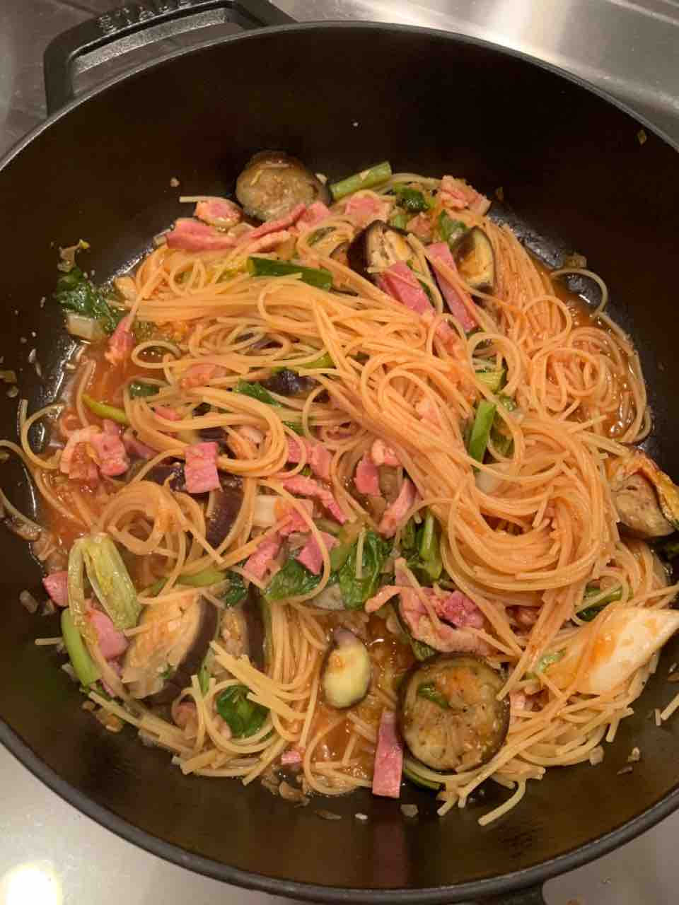 ベーコン、玉ねぎ、小松菜、茄子 で低糖質トマトパスタも作りました。