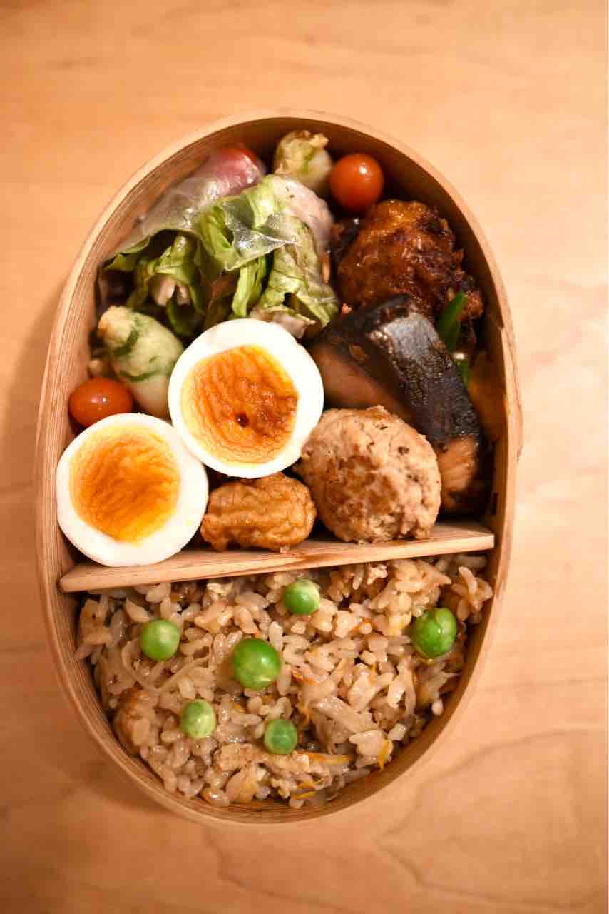 生春巻き、一口さつま揚げ、鶏の唐揚げ、鰤幽庵焼き、鶏つくね焼き、半熟玉子、ミニトマト、五目御飯、グリーンピース。