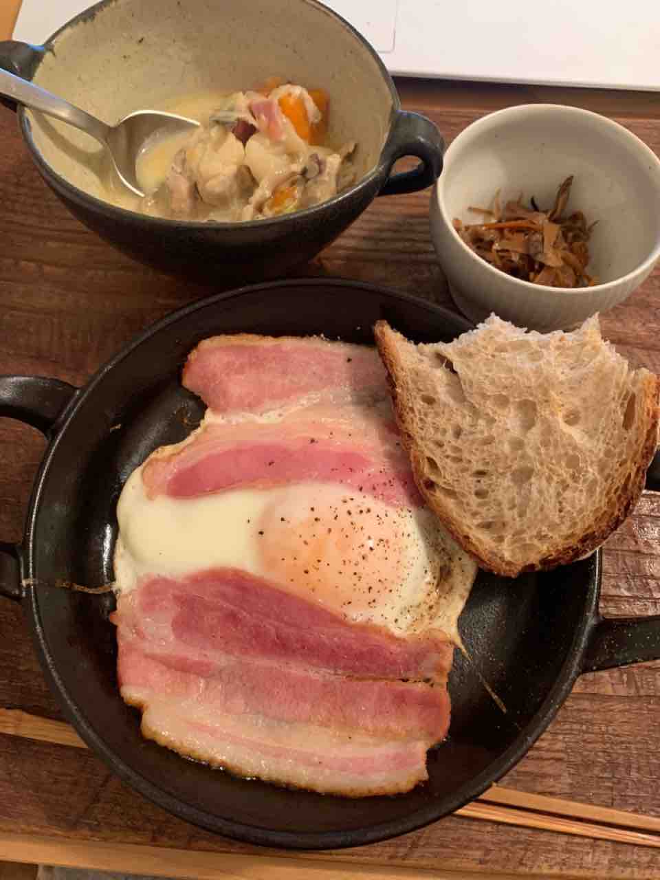 残りの半分はきんぴらごぼうにして、お弁当おかず用に小分け冷凍しました。少しだけ自分でも食べました。この日はチキンフリカッセ、きんぴらごぼう、ストウブのラウンドディッシュでベーコンエッグも作り、薄切りのカンパーニュを少しだけ合わせました。