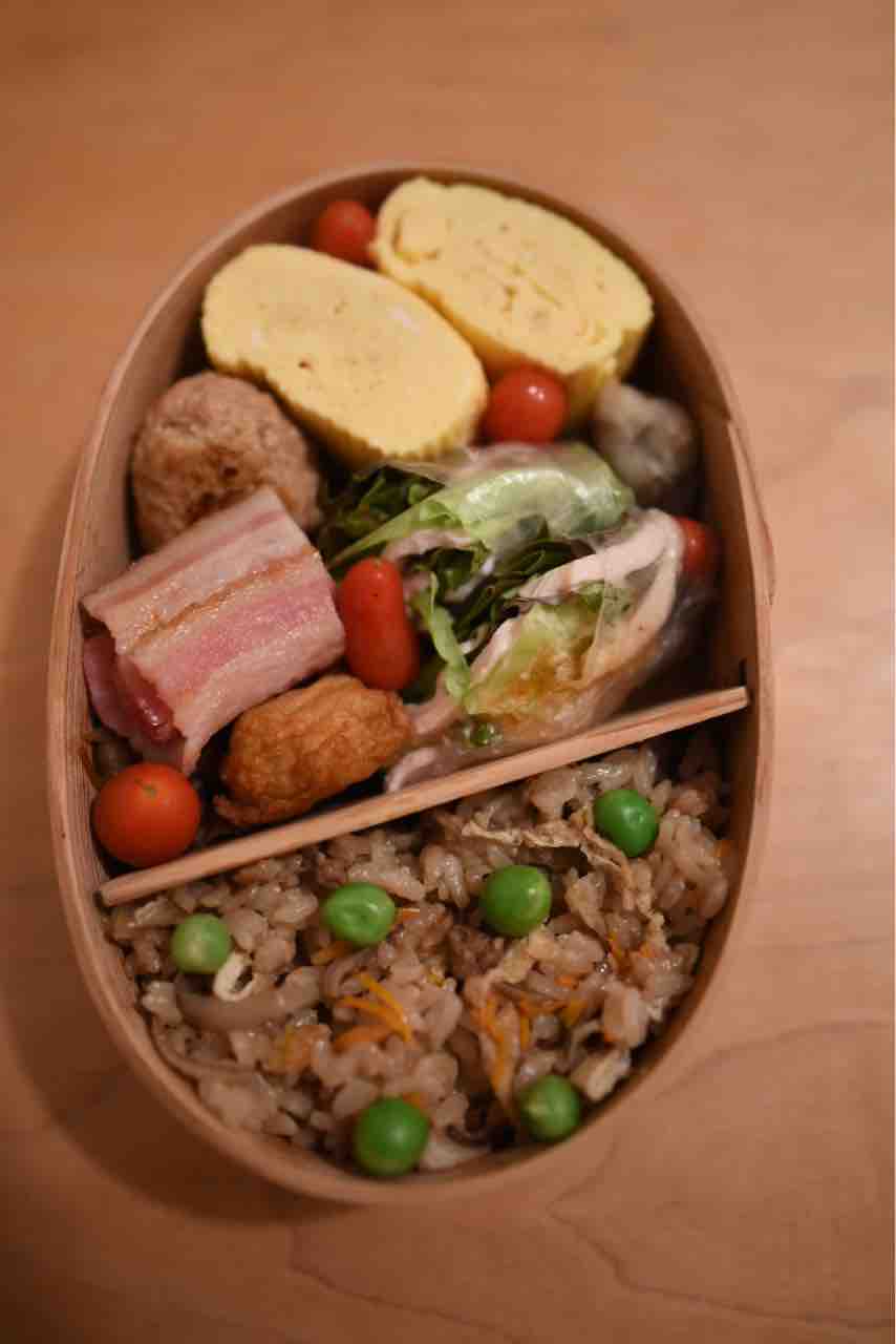 またある日は。出汁巻き玉子、生春巻き、鶏つくね焼き、一口さつま揚げ、きんぴらごぼう、ベーコン、ミニトマト、五目御飯、グリーンピース。