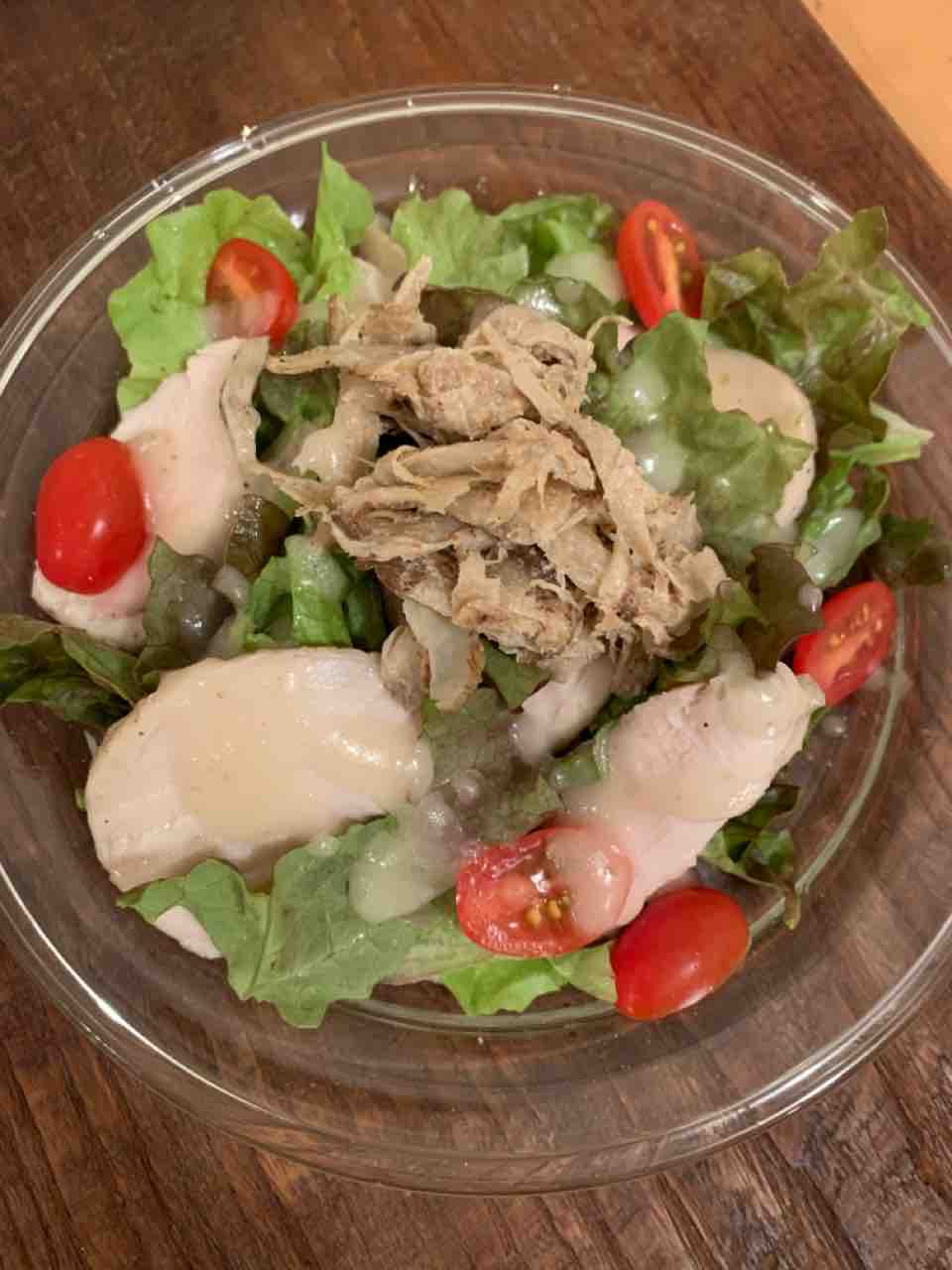 ごぼうはささがきにして半分は茹でて胡麻マヨネーズ酢で合わせてごぼうサラダを作り、低温調理の鶏ハム、サニーレタス、ミニトマト でサラダも作りました。