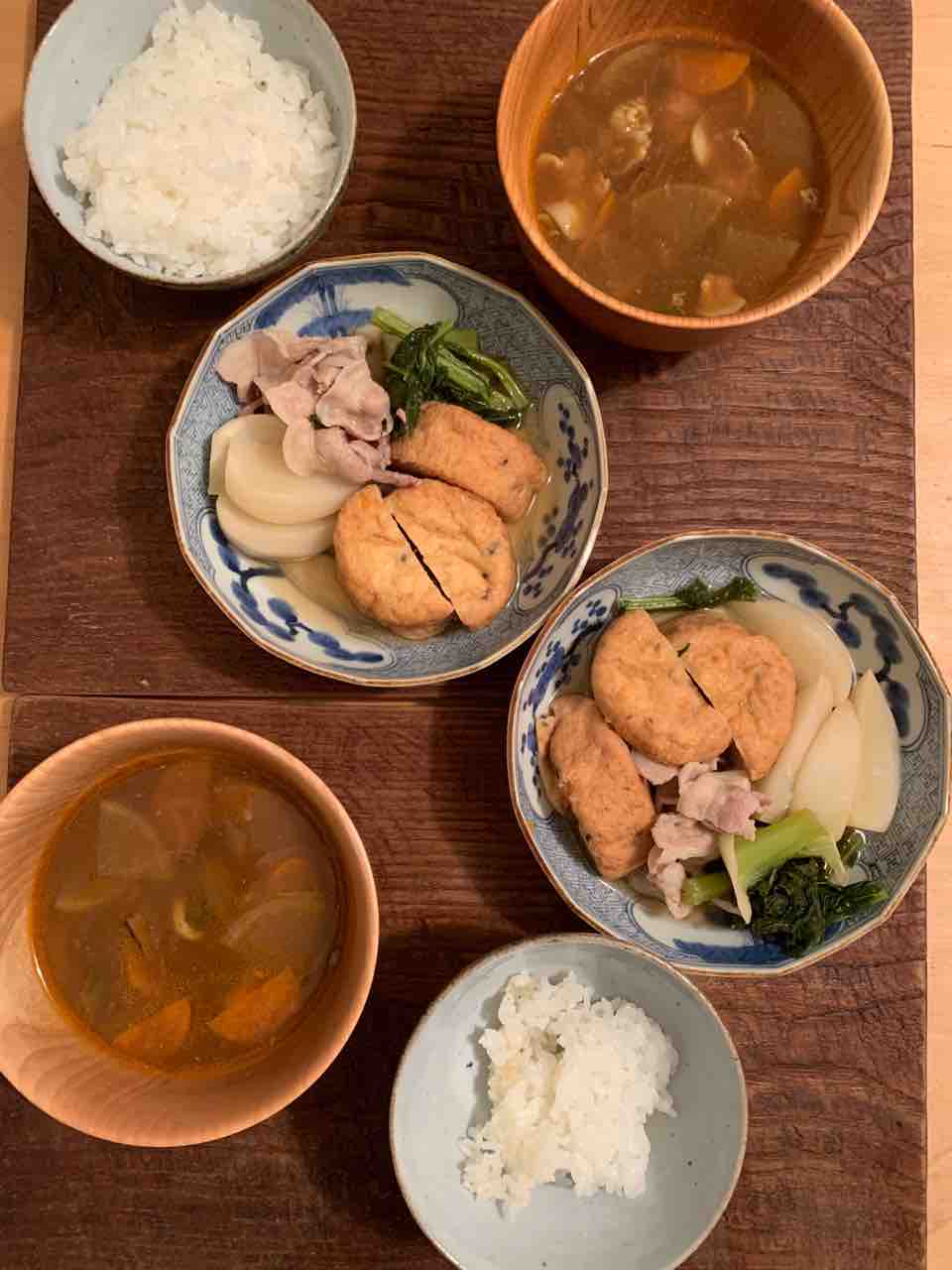 お友達が遊びに来たので、またも出汁を引き、新鮮なかぶ、豚ばら肉、がんも を炊きました。薄口醤油と赤酒を使ったので見た目よりもしっかりと味が付いてすごくおいしかったです。カレー汁も温め直して食べきりました。