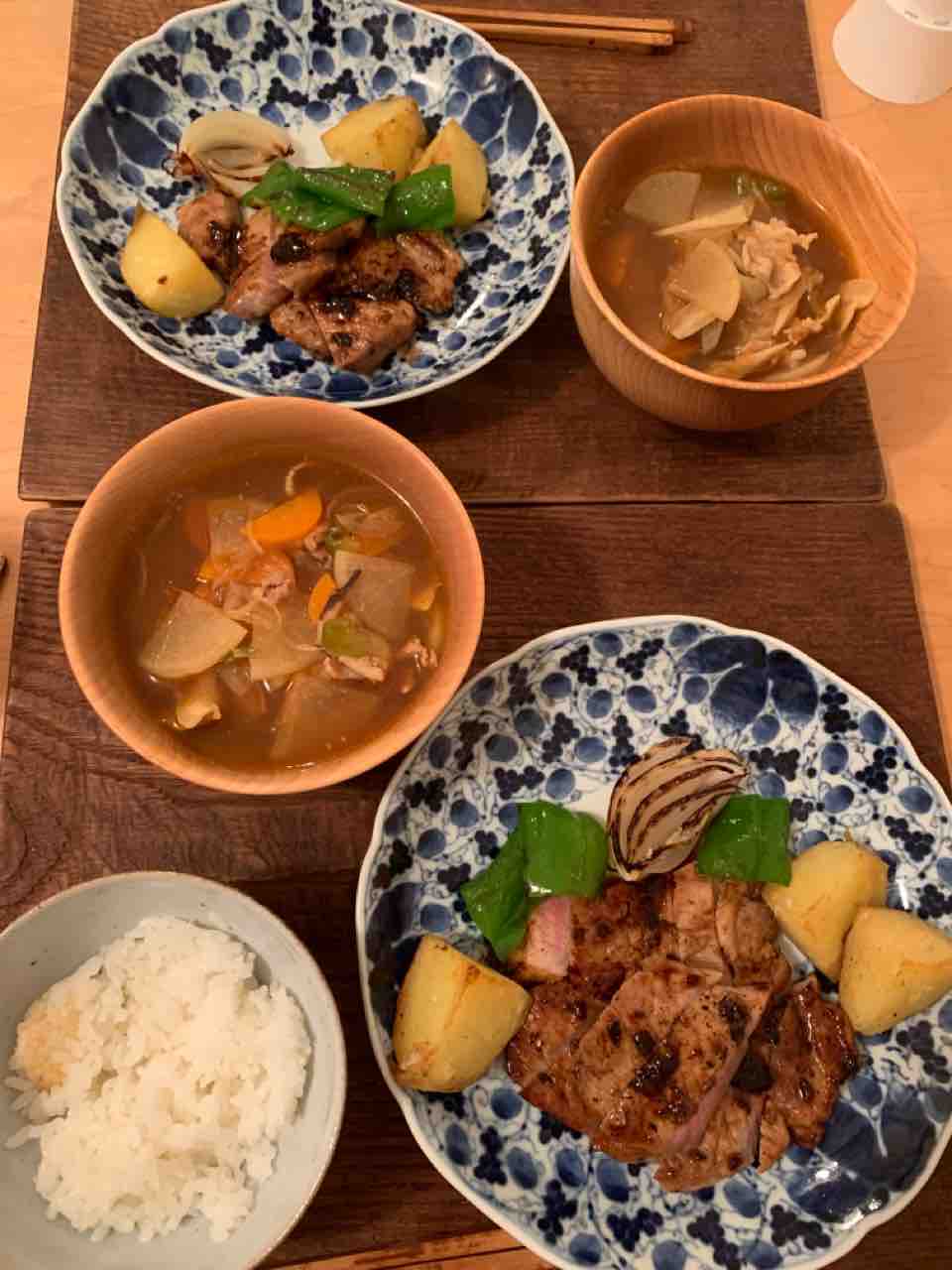 豚ロース肉の厚切りを買っていたので塩麹をまぶして寝かせ、拭き取って自家製のステーキソースでステーキにしました。付け合わせには玉ねぎ、じゃがいも、ピーマンも焼き付けました。すごくおいしかったです。