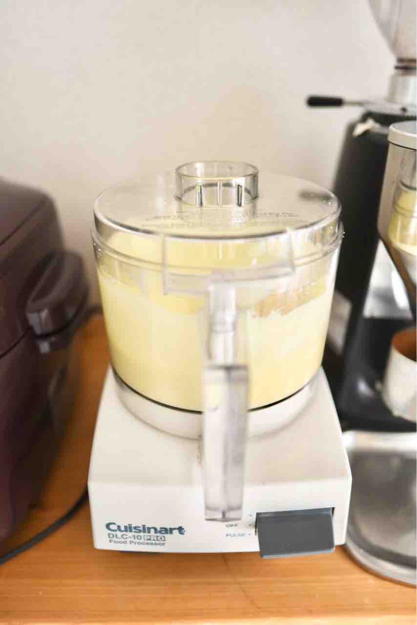 この本ではハンドミキサーを使っていますが、私は大型のスタンドミキサーしか持っていないので、今回はフードプロセッサーを使いました。一瞬でなめらかな生地ができあがりました。