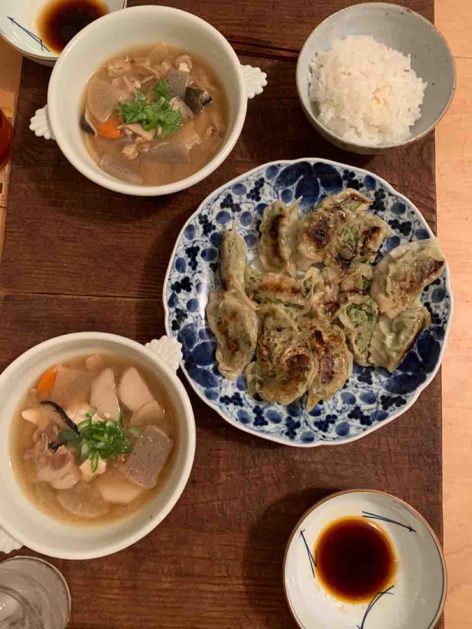 お友達が遊びに来たので、餃子を作りました。餃子には、豚ひき肉、白菜、椎茸、ニラ、長葱 を入れました。