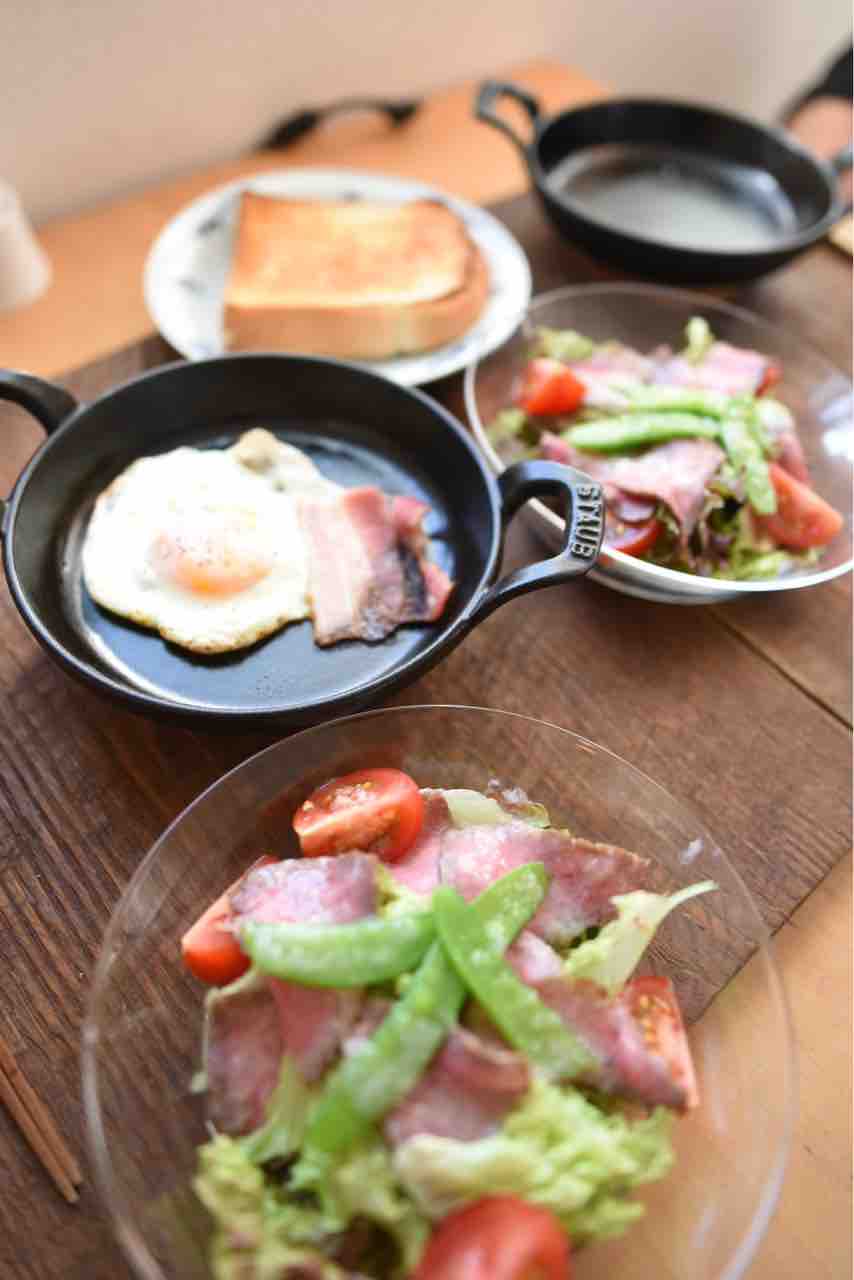 ある日の朝食。ベーコンエッグ、黒毛和牛A5モモブロックのローストビーフを使ったサラダ、トースト。