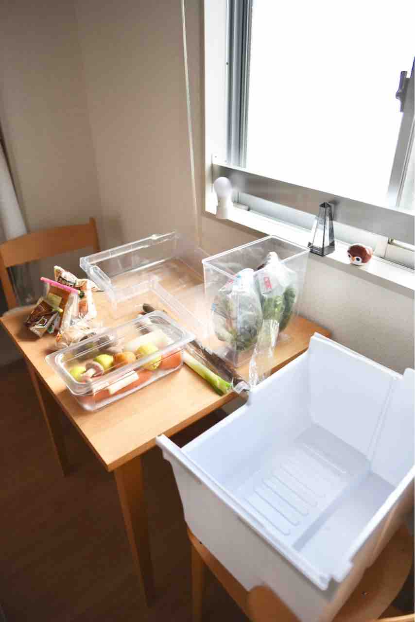 冷蔵庫の中も棚を拭き、残り食材を料理に使い、長期保存のもので少しずつ使っていって量が減ったものは、小さな保存容器に移し替えたりしました。