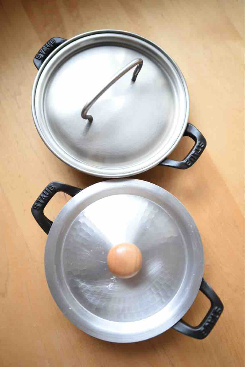 フタは専用のものがないので、木屋のアルミのフタと、手持ちのフィスラー プロコレクション ソースパン 16cmのものを無理矢理使っています。ピッタリとははまらないので、専用のフタがあったらどんなに楽しかっただろうかと想像します。ピコ・ココットの16cmを買ってその蓋を流用すればいいのか・・・?めっちゃ金かかるし、16cmのココットは要らないです。別の素材でもうすこし探してぴったりなものを見つけてみようかと思います。