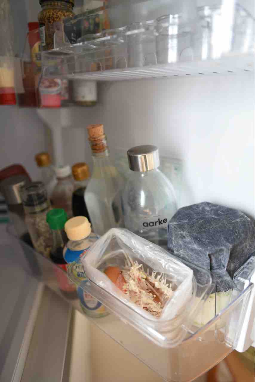 何用かというと、冷蔵庫内の生ごみ入れに使います。これまで、コーヒーかすや野菜くずなどの植物性のごみは布製の巾着に入れ、ベランダに干してカラカラにしてから捨てていました。