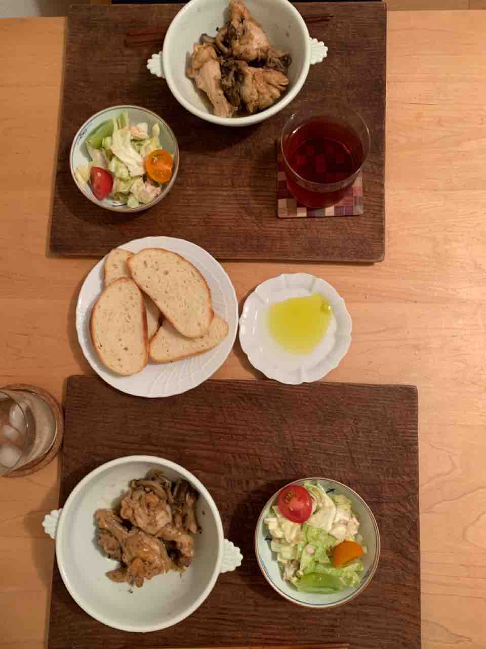 お友達がおかずと自家製パンを持って遊びに来てくれました。おかずは鶏手羽元とぶなしめじのバルサミコ煮、キャベツとツナのサラダ。すごくおいしかったです。