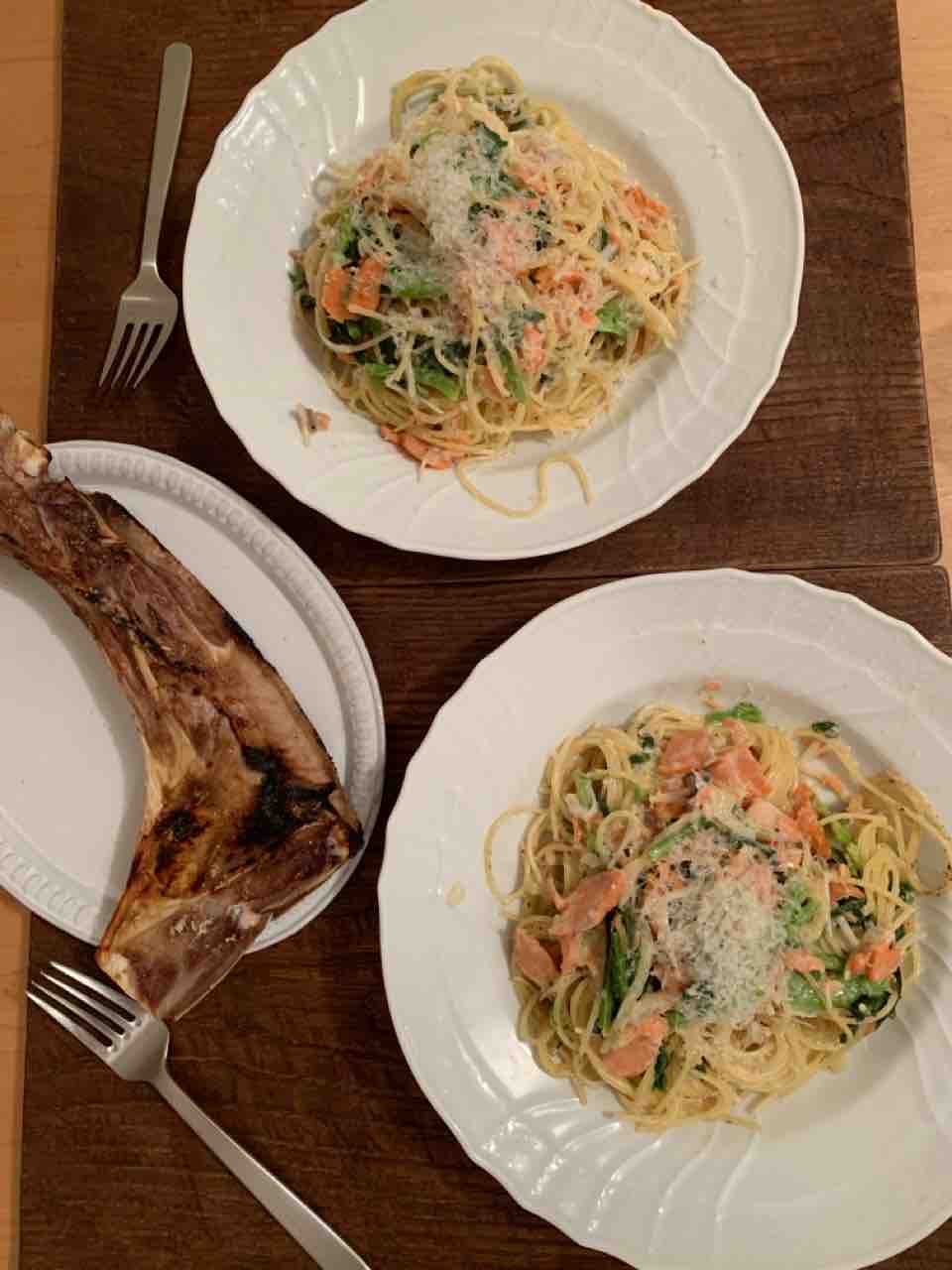 鮪のカマを入手したのでグリルで焼いて、鮭、かき菜、えのきだけ でサワークリームパスタを作りました。すごくおいしかったです。