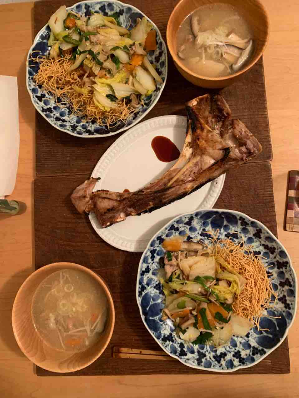 残っていたカマをまた焼き、肉野菜炒め、低糖質パリパリ麺 で皿うどんを作り、豚汁とともに食べました。