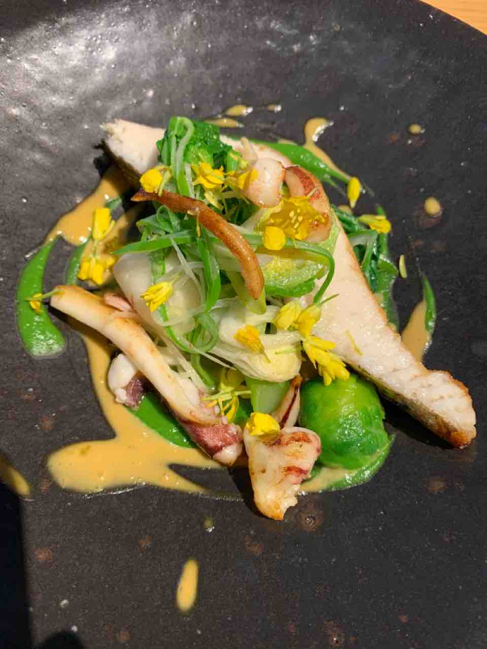 オイルで火入れした鰆。皮目を炙ってありました。スルメイカのげそ、蕪、芽キャベツ、菜の花。