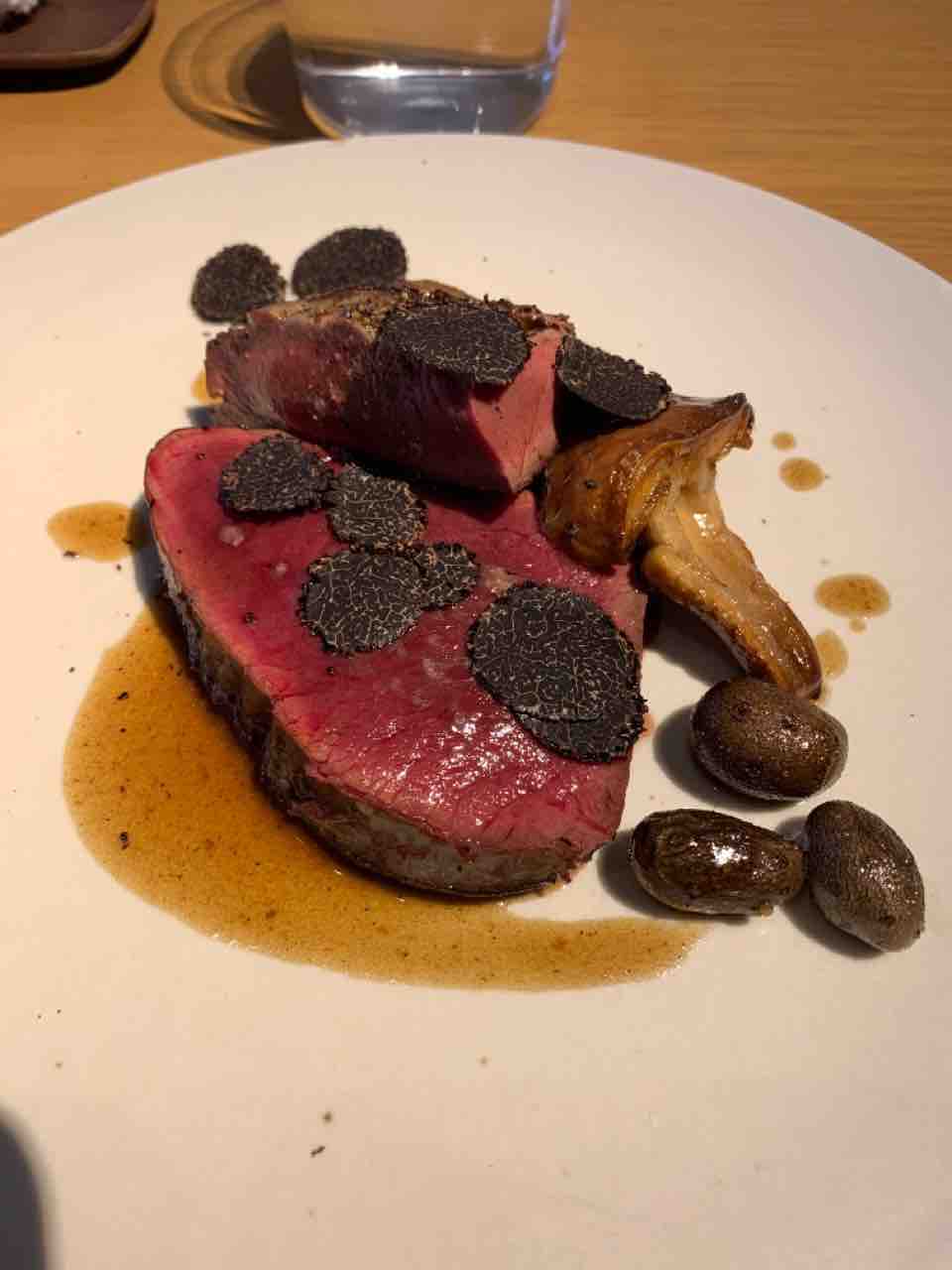 小田原市風祭で獲れた鹿のレバーとモモ肉のローストに、別料金で小田原で採れたトリュフをふりかけてもらいました。むかごとなめこ。柔らかくてすごくおいしかったです。