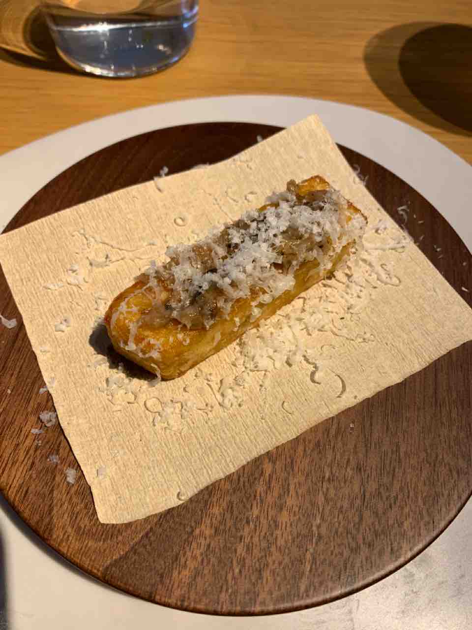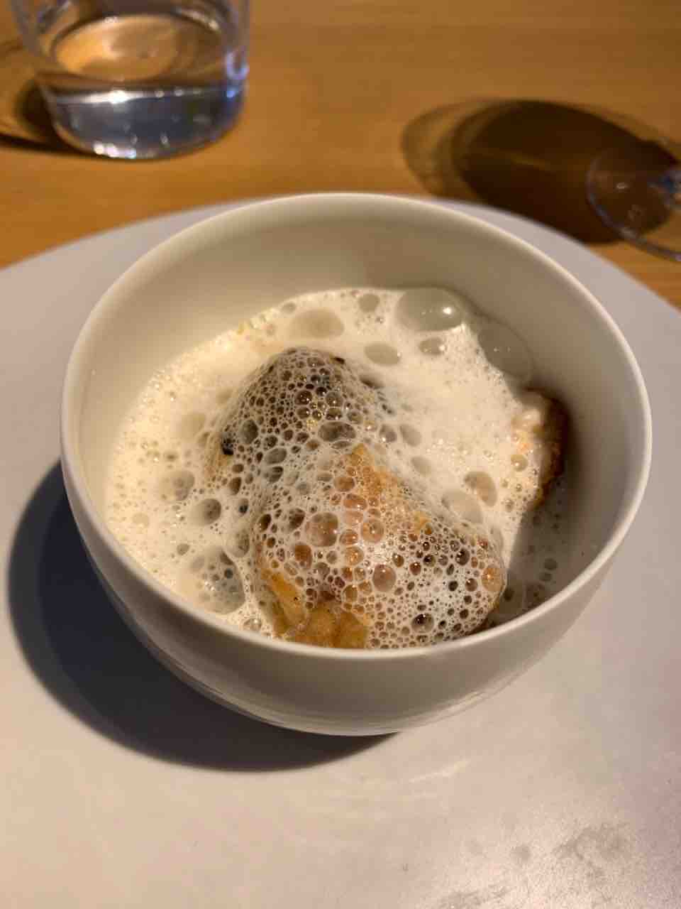 バターナッツのフラン、白子のフリット、ベーコンの泡をのせて。