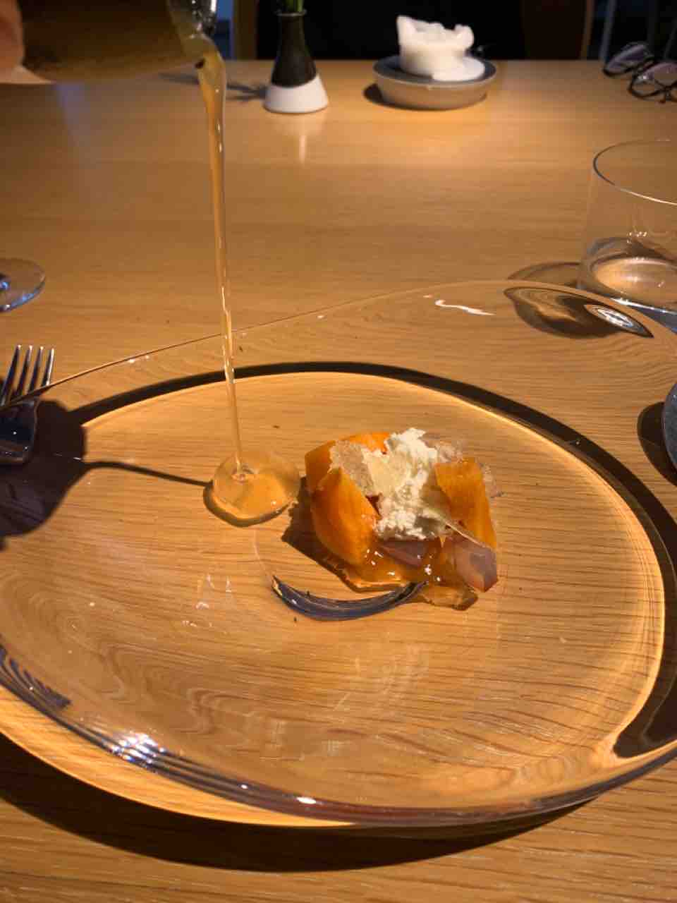 柿、ヨーグルトムース、ベルガモットのジュレ、発酵柿のソース。このベルガモットの香りが鮮烈ですばらしかったです。小田原産。