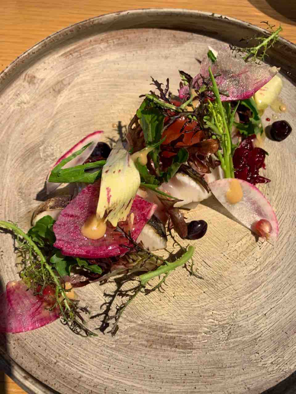 なまこ、鯖、鰤 のサラダ仕立て。発酵ブルーベリーが散らされていました。