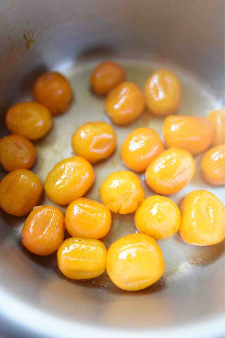 4. 鍋に金柑とシュガーカットゼロ顆粒、浸るくらいの水を加えて中火にかけ、時々かき混ぜ、徐々に火を弱めながら煮切ります。