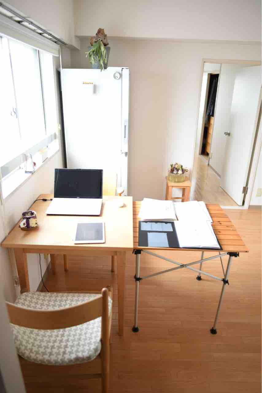 種々の契約のため、ダイニングテーブルにキャンプテーブルを並べて書類を広げた様子。