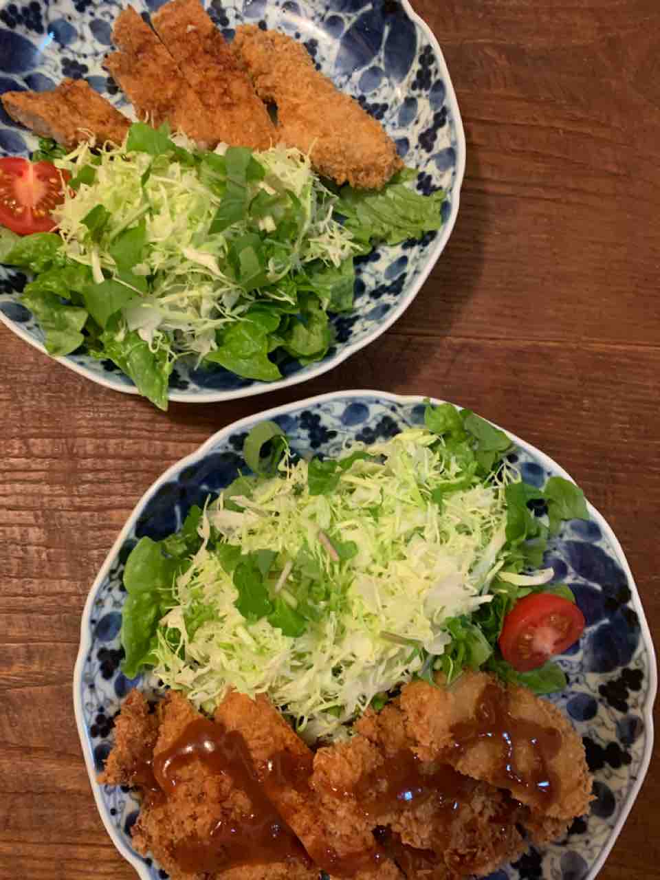 豚ロース肉と豚ヒレ でとんかつを作りました。春キャベツ、サンチュ、ルッコラ を細かく刻んで合わせました。