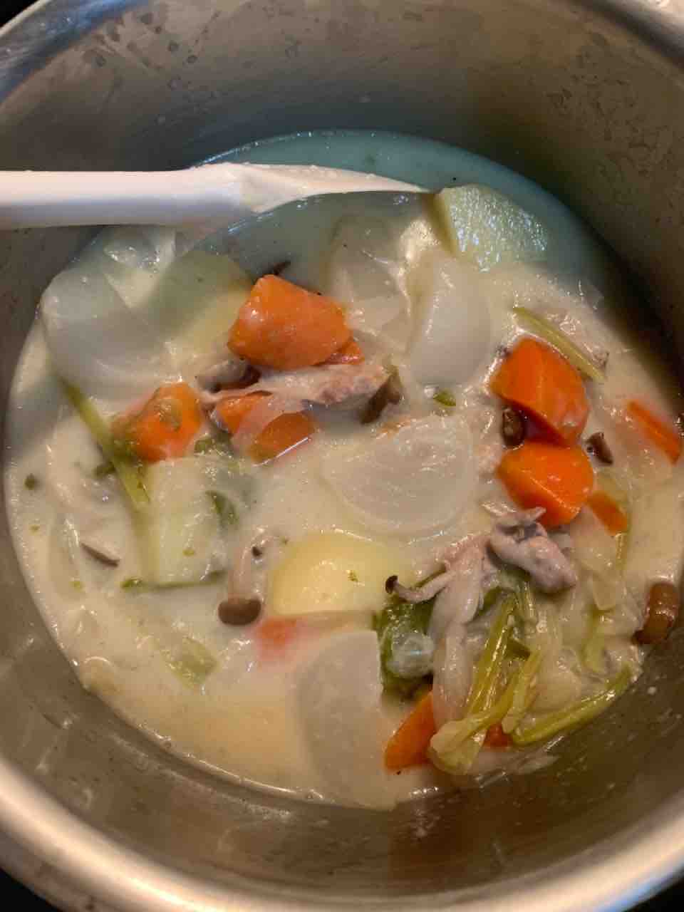 鶏もも肉、玉ねぎ、人参、じゃがいも、ぶなしめじ、キャベツの芯、かぶ でチキンフリカッセも作りました。