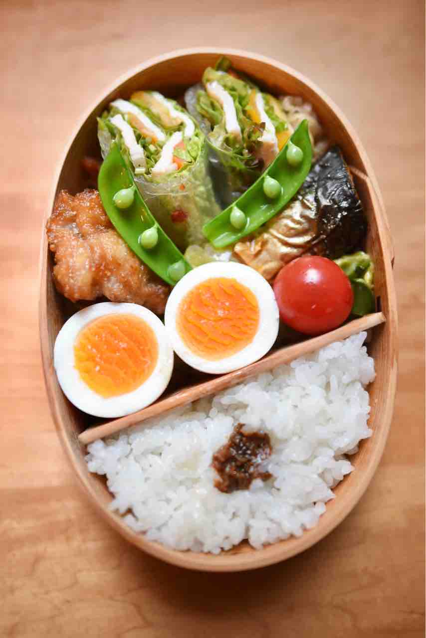 鯖塩焼き、鶏唐揚げ、鶏ハムの生春巻き、切り干し大根、肉野菜炒め、半熟玉子、ミニトマト、スナップエンドウ、白飯、蕗味噌。