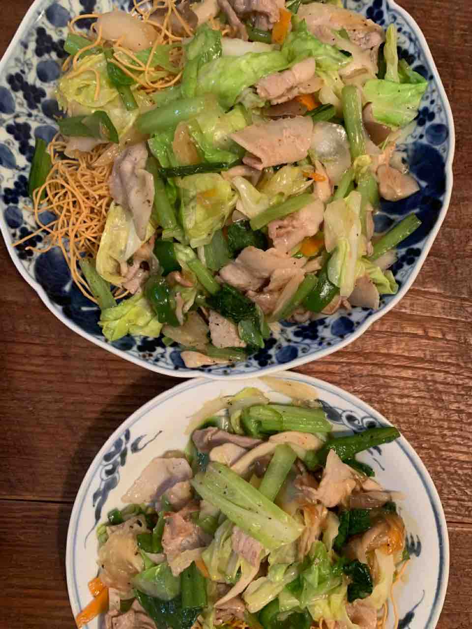 豚ばら肉、春キャベツ、小松菜、ぶなしめじ、人参 で野菜炒めを作り、低糖質パリパリ麺の上にかけて皿うどんにしました。