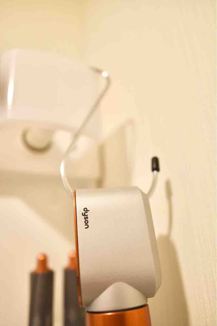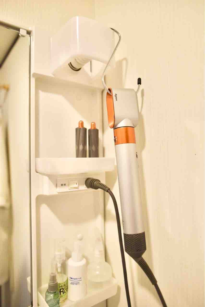 100円ショップで買った特大のS字フックに引っ掛けるだけです。さっと手に取れてコードも邪魔にならず、最高に使い勝手が良いです。エアラップスタイラーを単にドライヤーとして使っている息子にも好評でした。