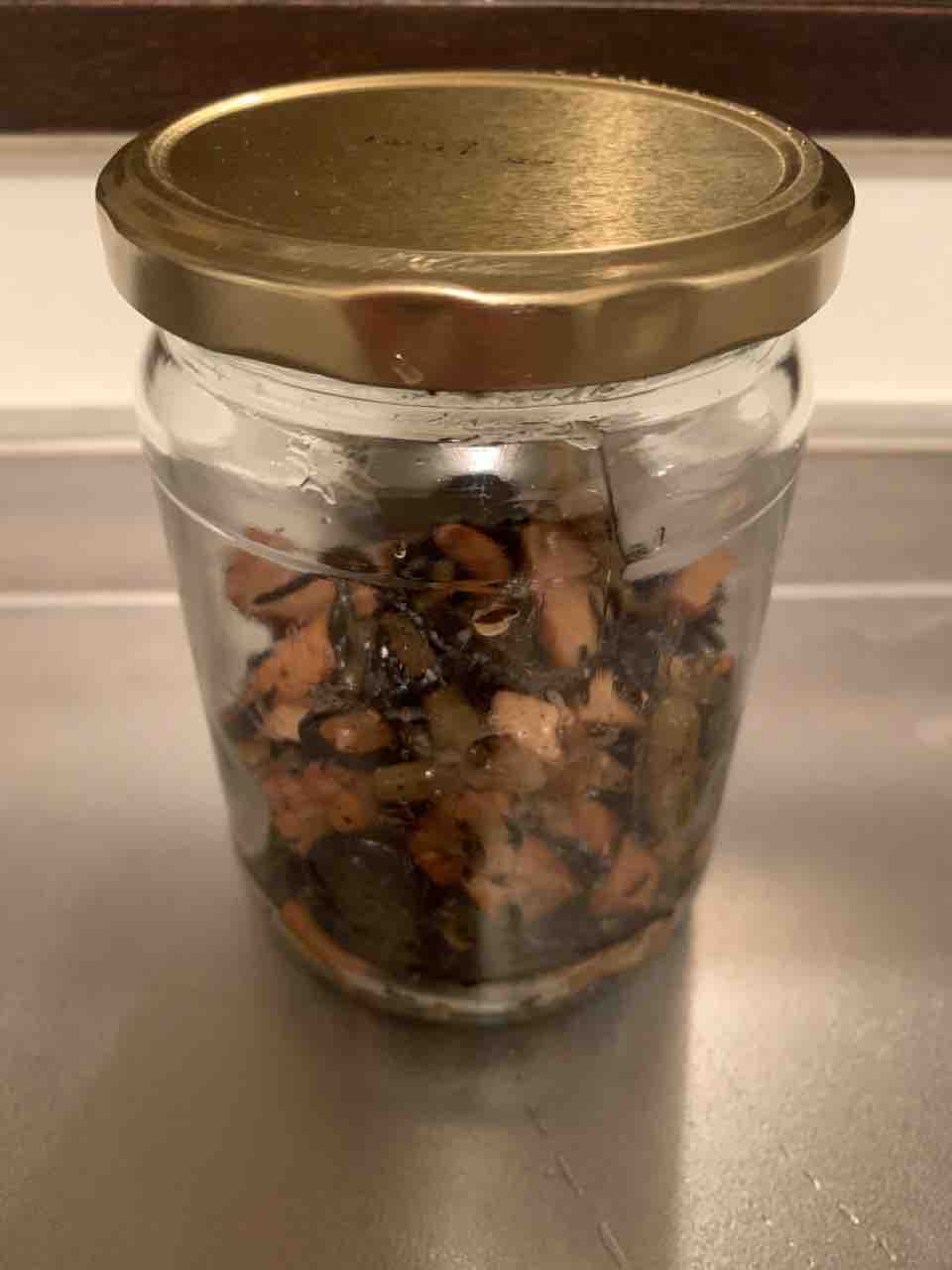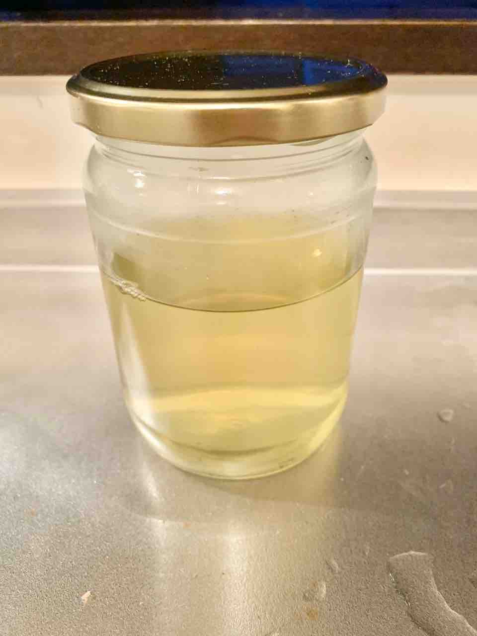 残った出汁も空きビンに入れました。これは、翌日ニラ玉汁にしました。