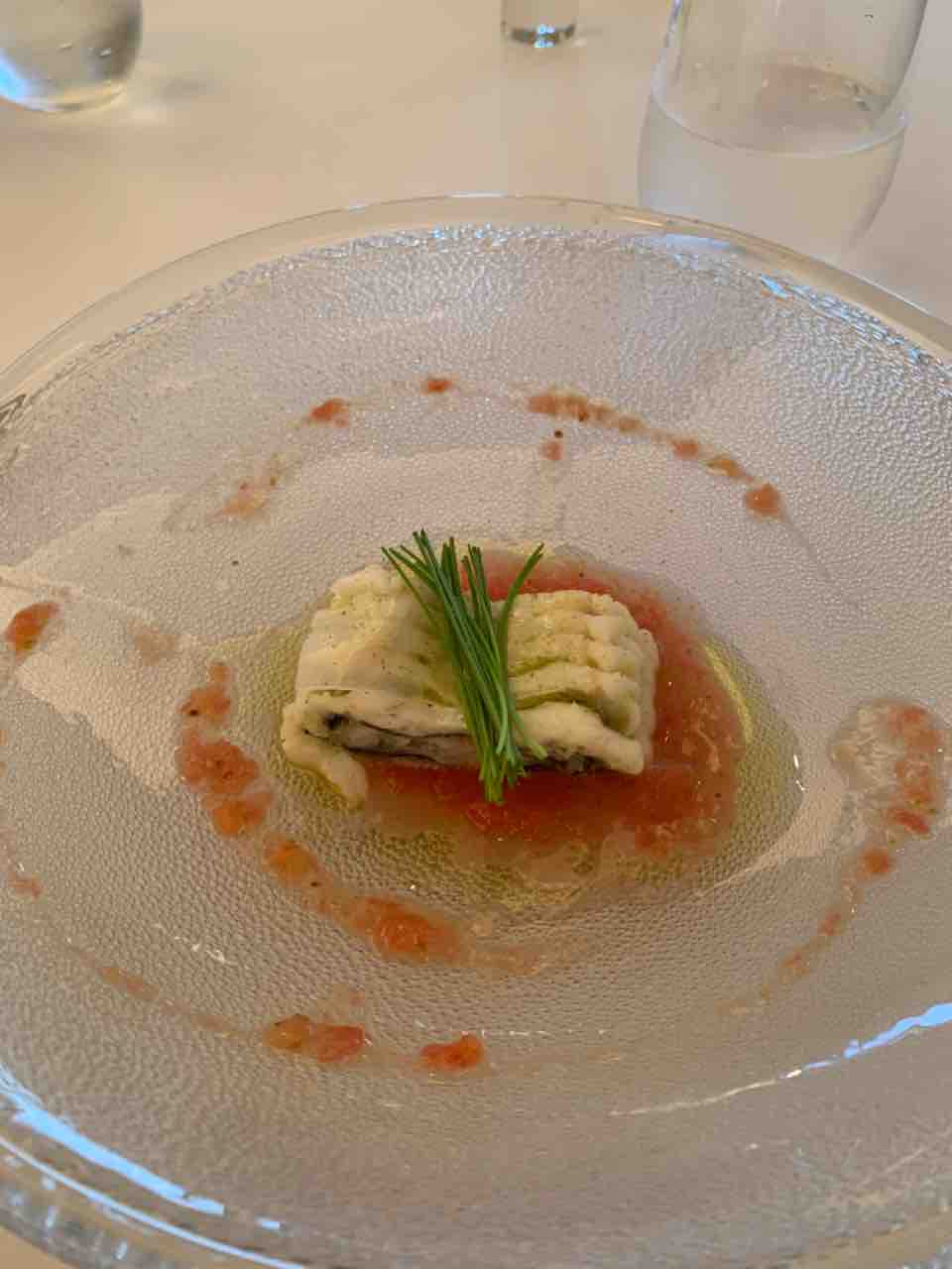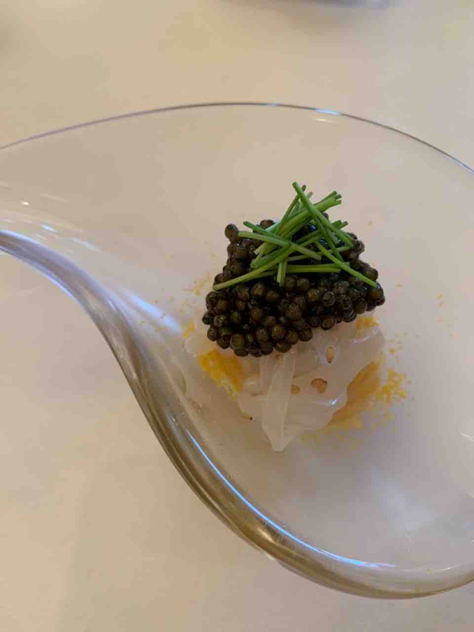 前菜は、カッペリーニにカラスミをかけ、アオリイカとオシェトラキャビアを合わせたもの。絶品でした。