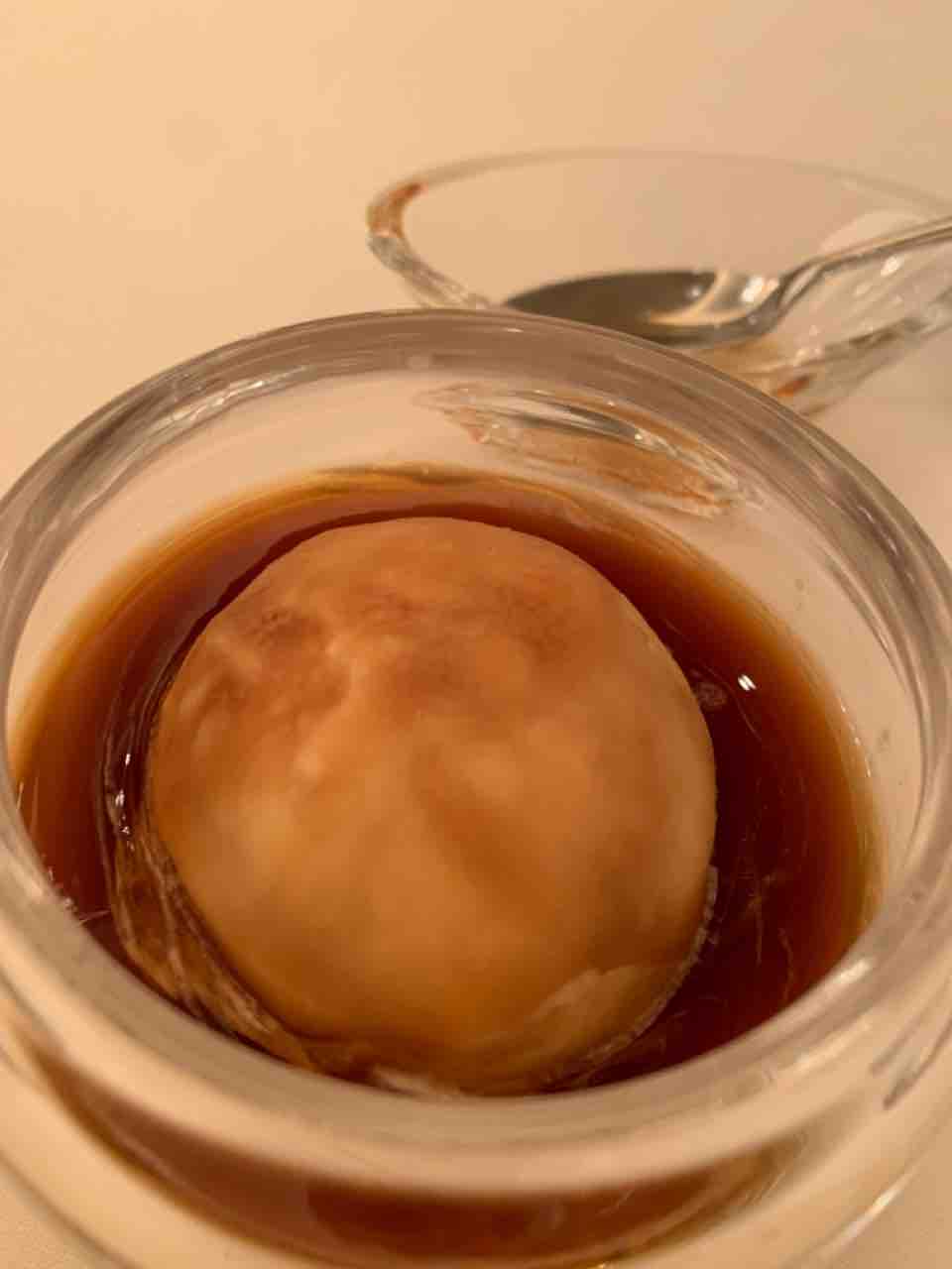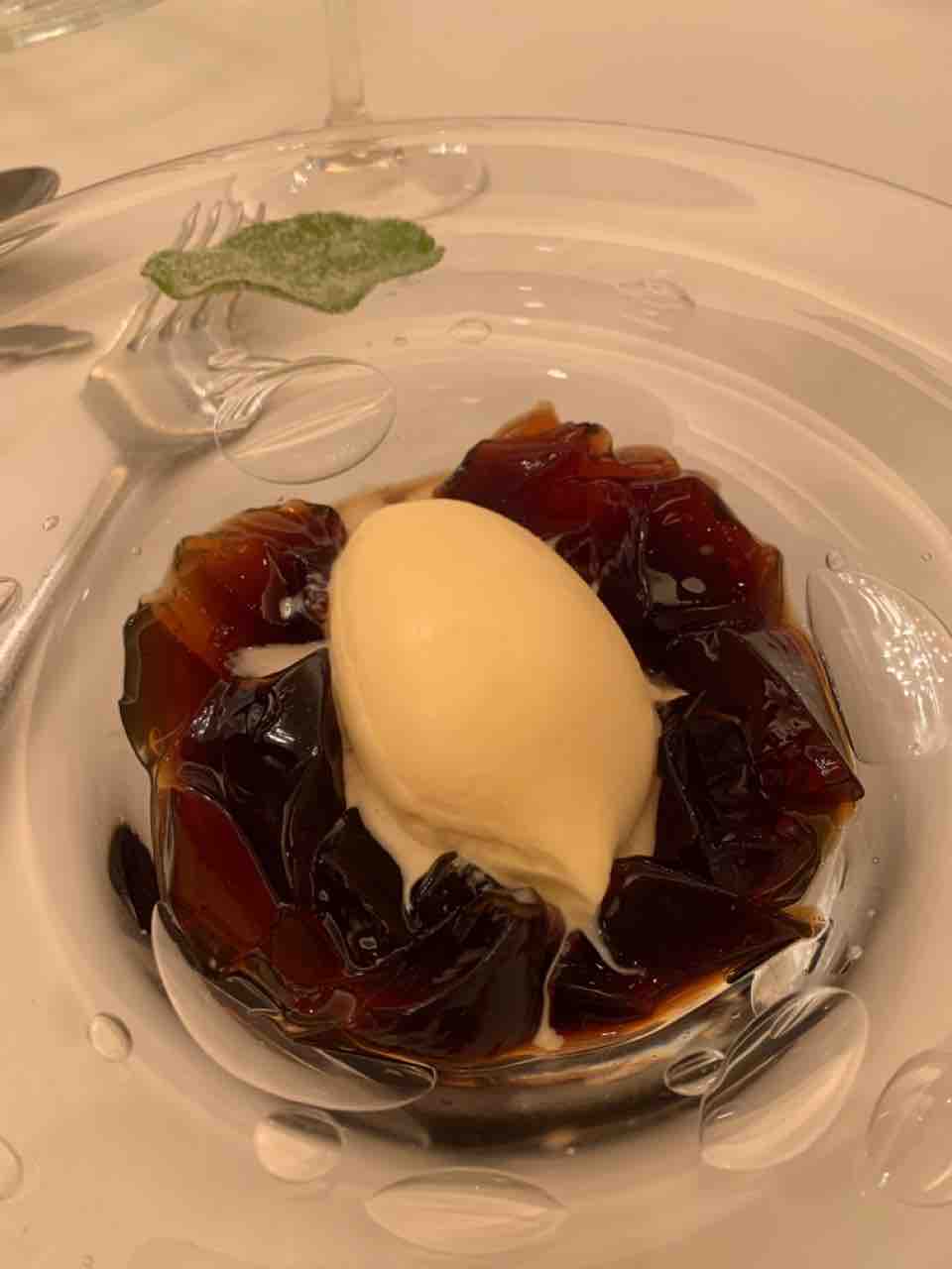 デザートは色々ある中から、まさかのコーヒーゼリーを選びました。こちらは、コーヒーにバイマックルー(こぶみかんの葉)の香りを移してから固めています。一見合わなそうな柑橘の香りとコーヒーが見事に合っていて絶品でした!