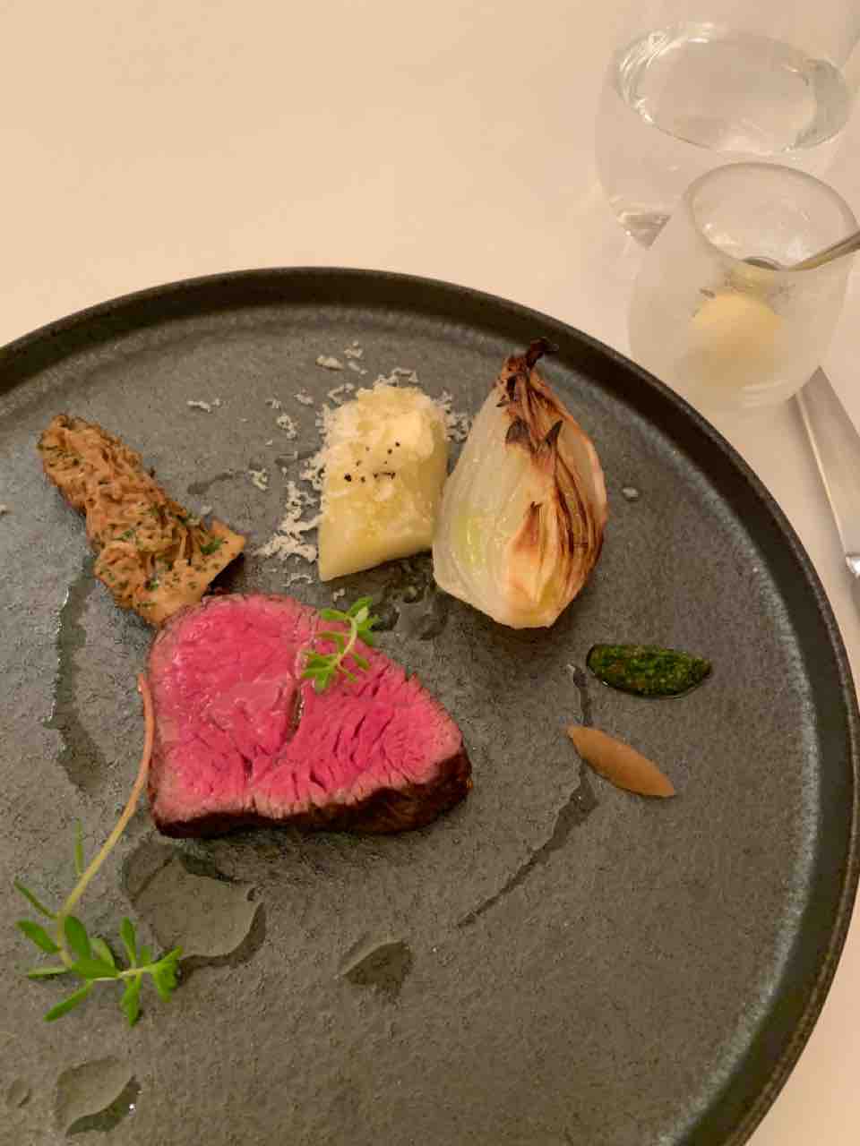 箸休めのレモンとパッションフルーツのシャーベットと、無角牛のフィレ肉のステーキ。玉ねぎと鮎魚醤を合わせたものが薬味として添えられていました。