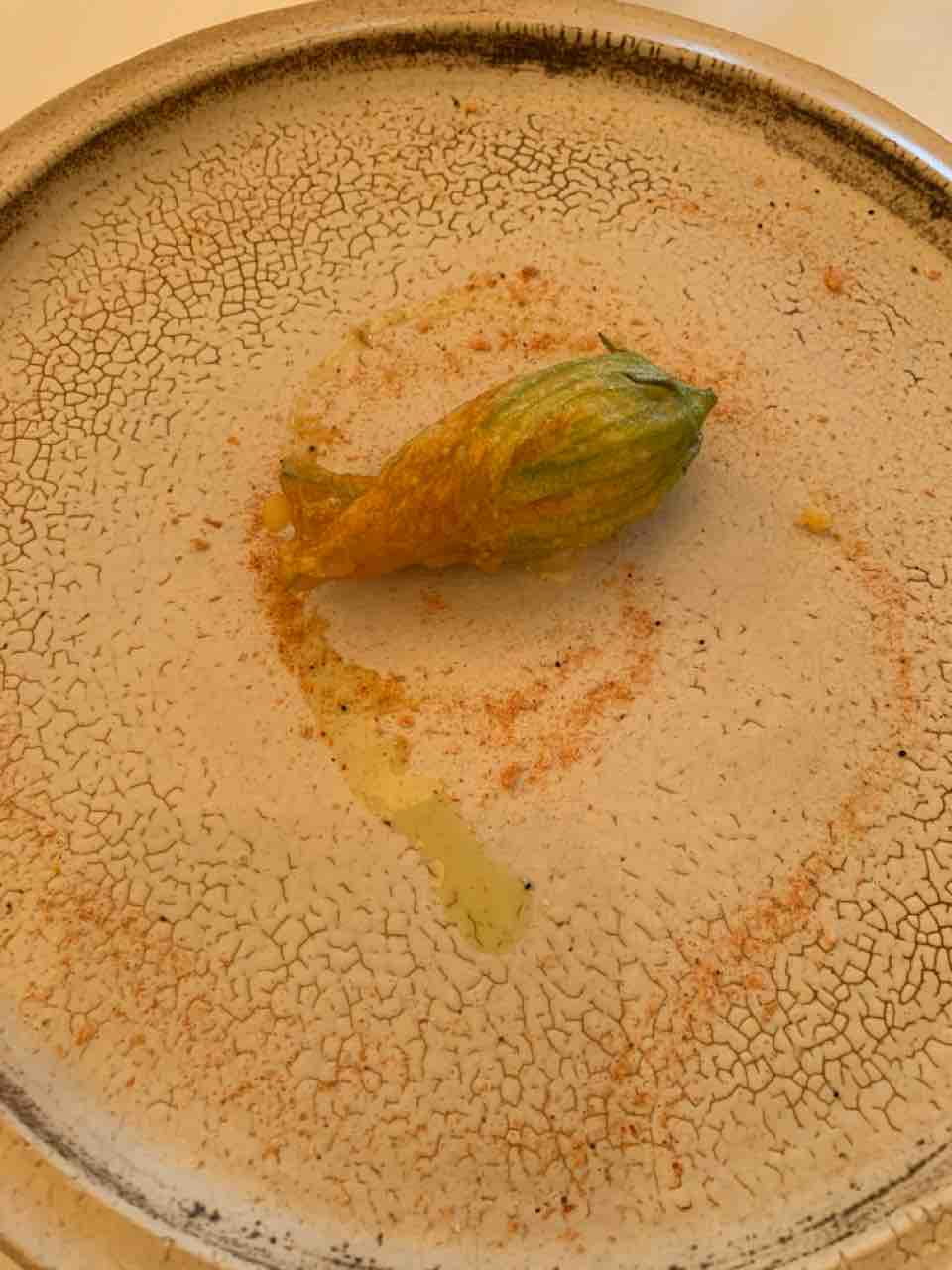 花ズッキーニに桜海老とサフラン風味のリゾットを射込んで揚げたもの。外側はサクサクで中はとろりとしていてこれまた絶品でした。