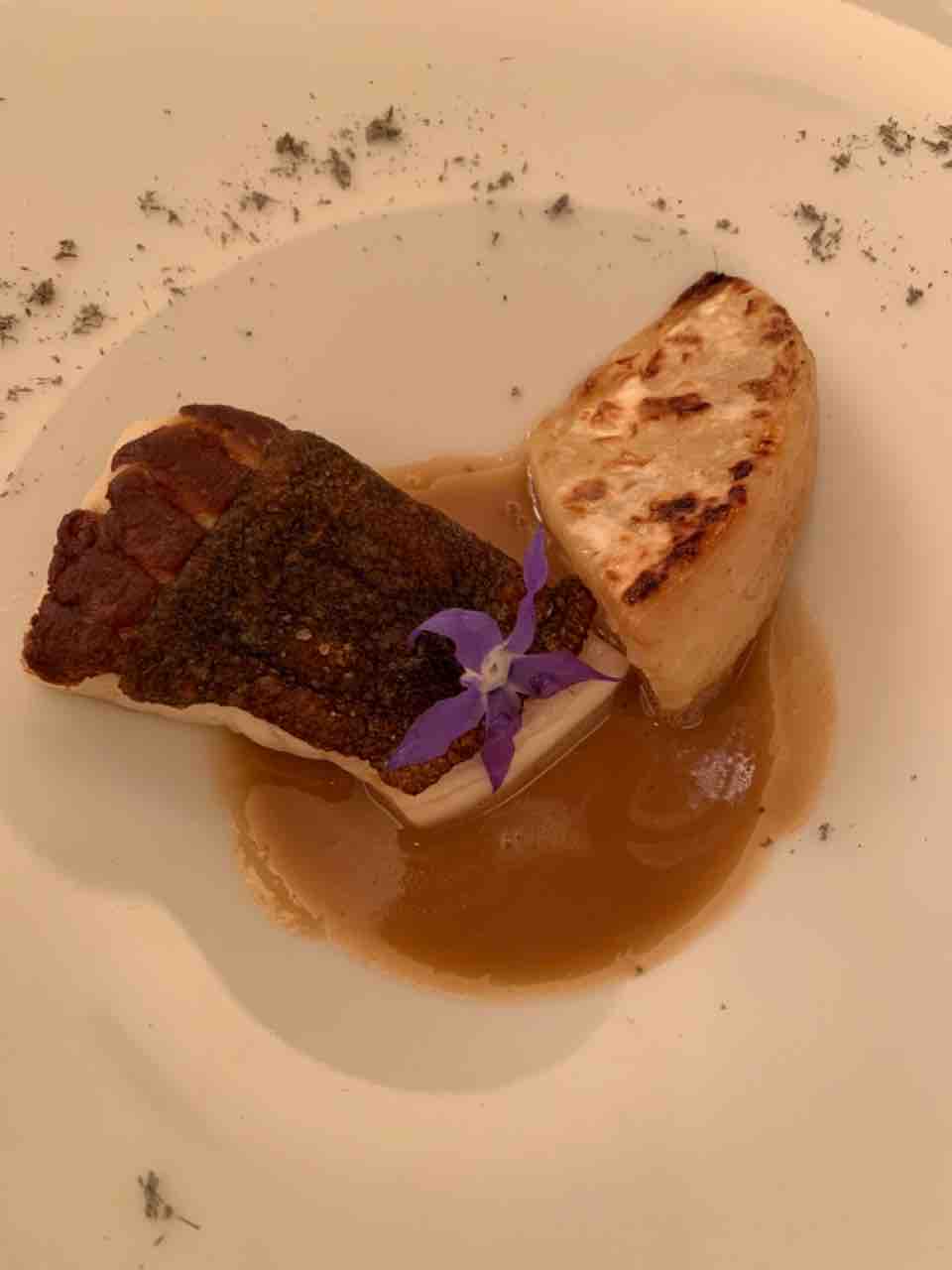 焼物は、石鯛と根セロリにラベンダー風味のソースをかけたもの。