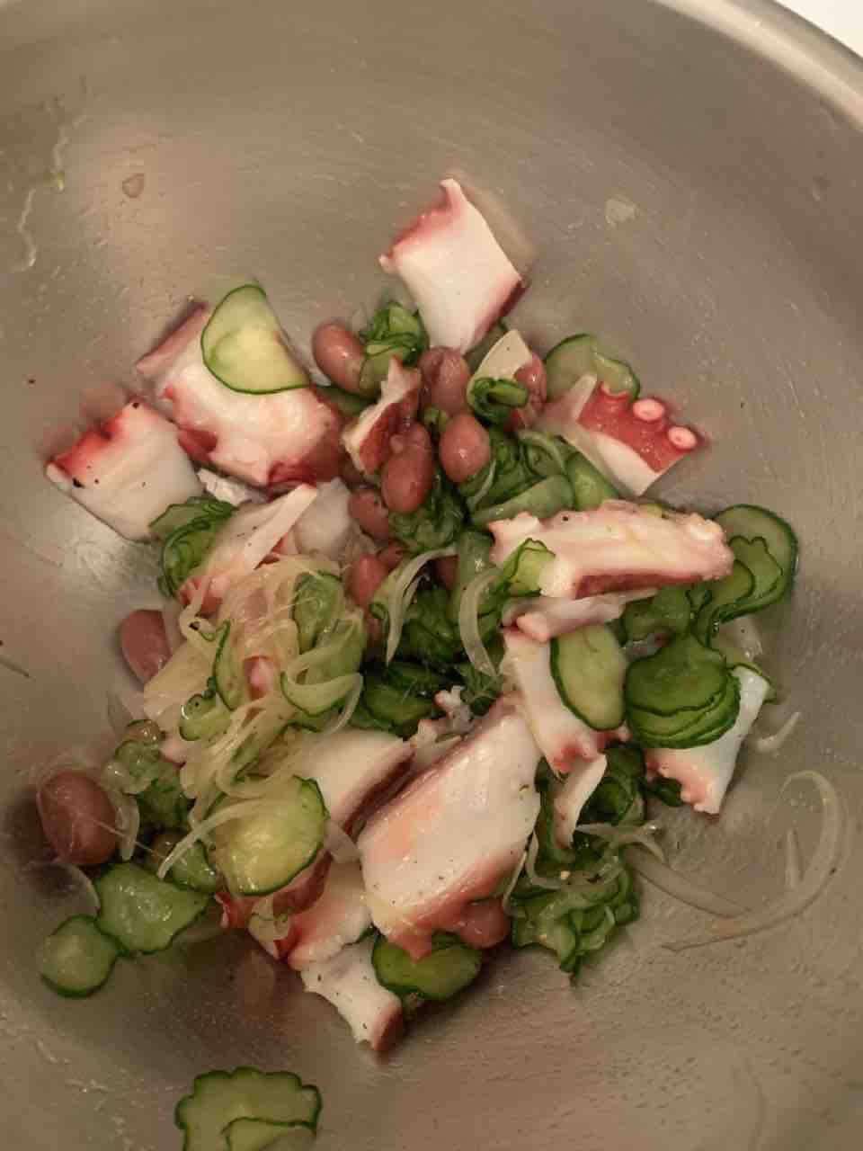 大正金時豆を買ったので、一晩水に浸けてから電気IH圧力なべで軽く煮込みました。玉ねぎときゅうりの塩もみにタコ、金時豆 を加えて塩胡椒とオリーブオイルで和えました。