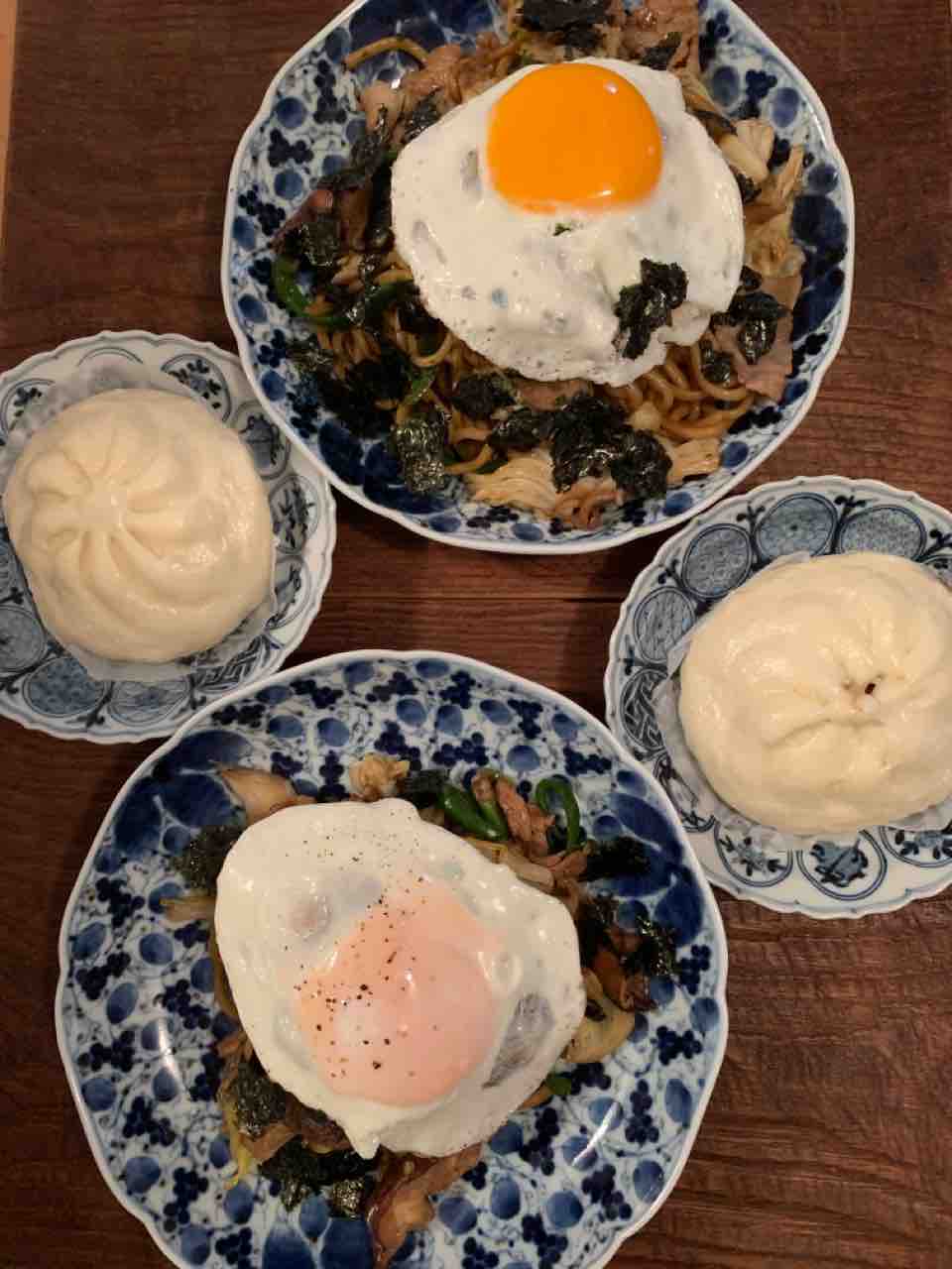 お友達が成城石井の肉まんを持って(?)遊びに来たので、温めて、焼きそばも作って食べました。残り物処理の焼きそばには、青海苔と焼き海苔の2種類の海苔をかけました・・・。