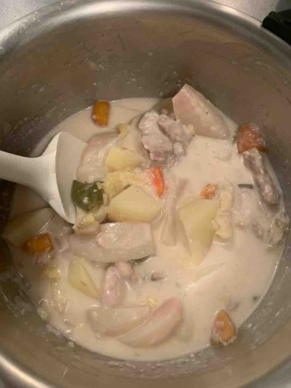 鶏もも肉、玉ねぎ、人参、ピーマン、じゃがいも、ぶなしめじ、かぶ でチキンフリカッセを作りました。余っていた生クリームでホワイトソースを作ったので濃厚ですごくおいしかったです。