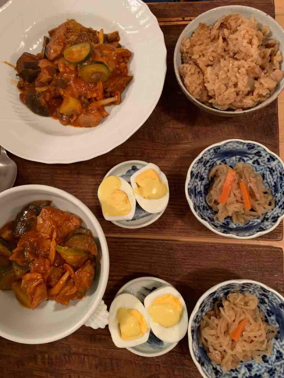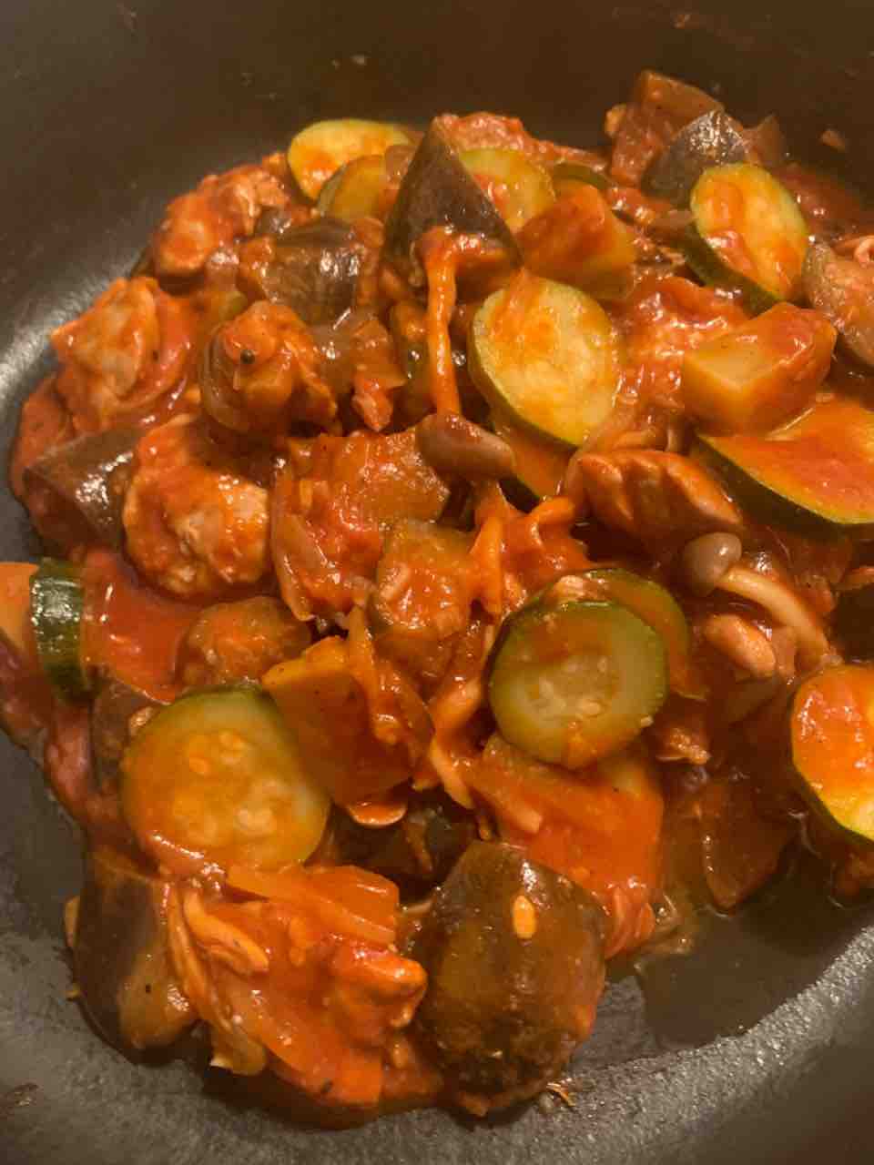 鶏もも肉、玉ねぎ、ズッキーニ、ブロッコリーの茎、ぶなしめじ、茄子 でトマト煮も作りました。