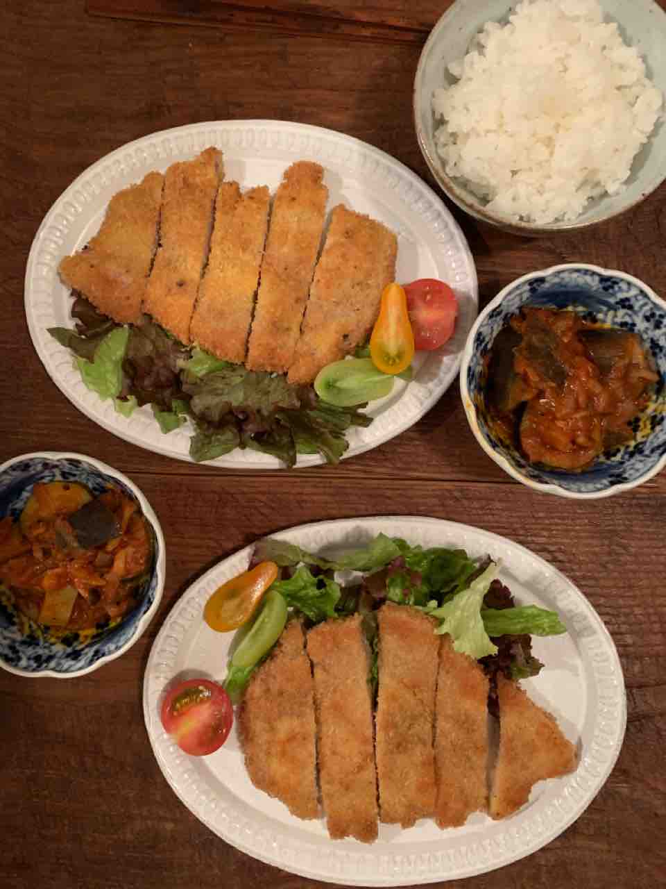 豚ロース肉の1cmほどの厚さの肉を買ってきて、小鍋で叩いてのし、とんかつにしました。少ない油で揚げ焼きにしました。すごくおいしかったです。